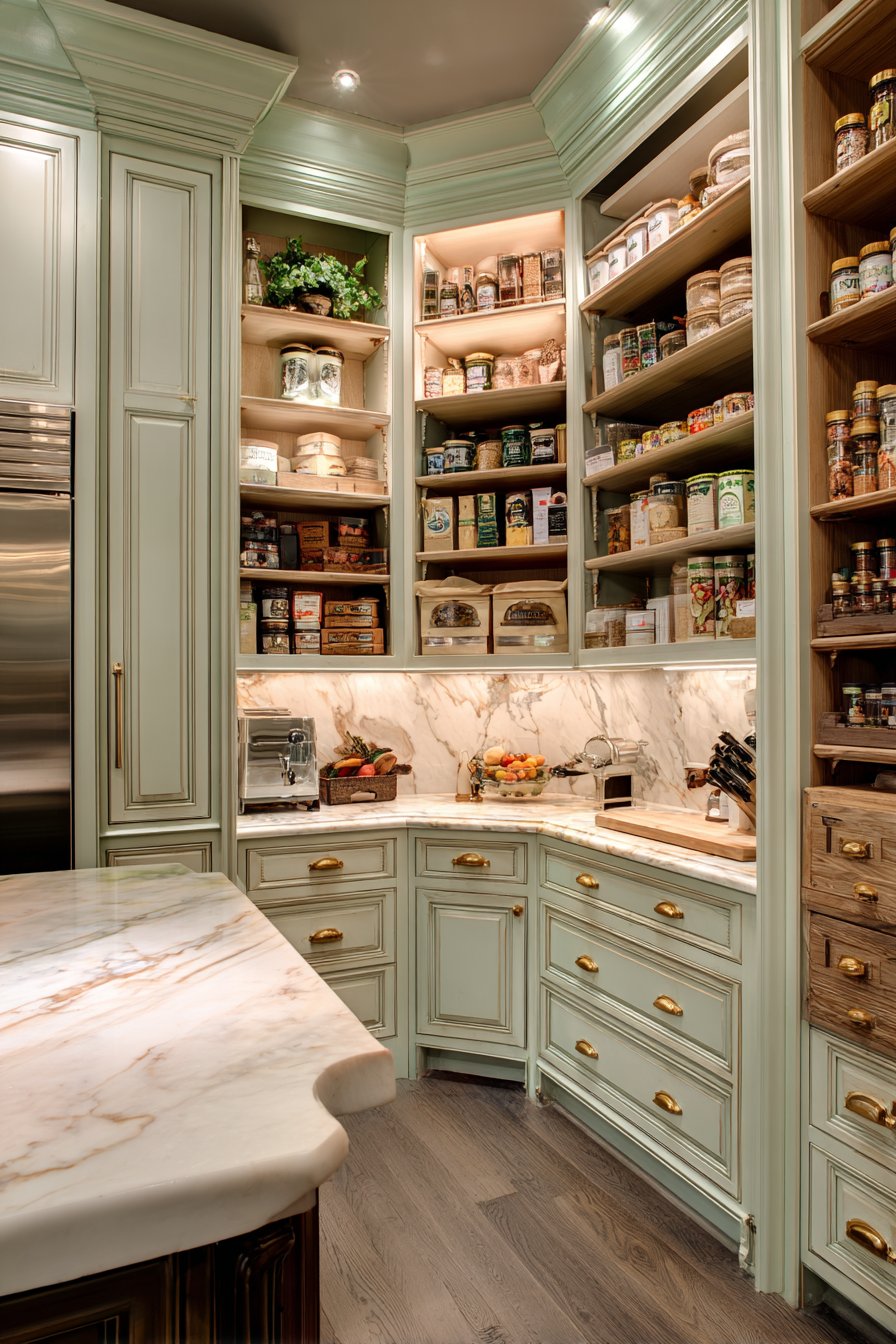 Custom built-in cabinetry in soft sage green creates sophisticated luxury in this walk-in pantry. Brass cup pulls and knobs add warm metallic accents throughout. Corner Lazy Susan units maximize difficult-to-reach spaces with rotating convenience. Pull-out spice racks flank the main shelving for easy access to frequently used ingredients.