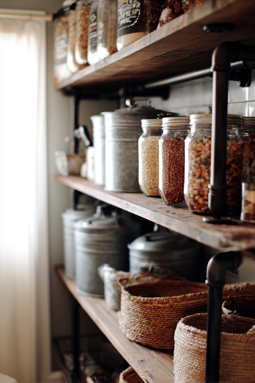 Industrial pipe shelving with natural wood planks creates affordable character in this pantry makeover. The walnut-stained wood brings warmth to the utilitarian pipe framework. Galvanized metal bins and woven seagrass baskets provide textural variety while organizing bulk items. Magnetic strips mounted on walls hold frequently used kitchen tools within easy reach.