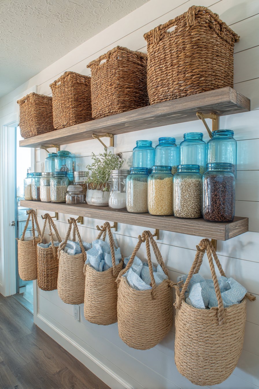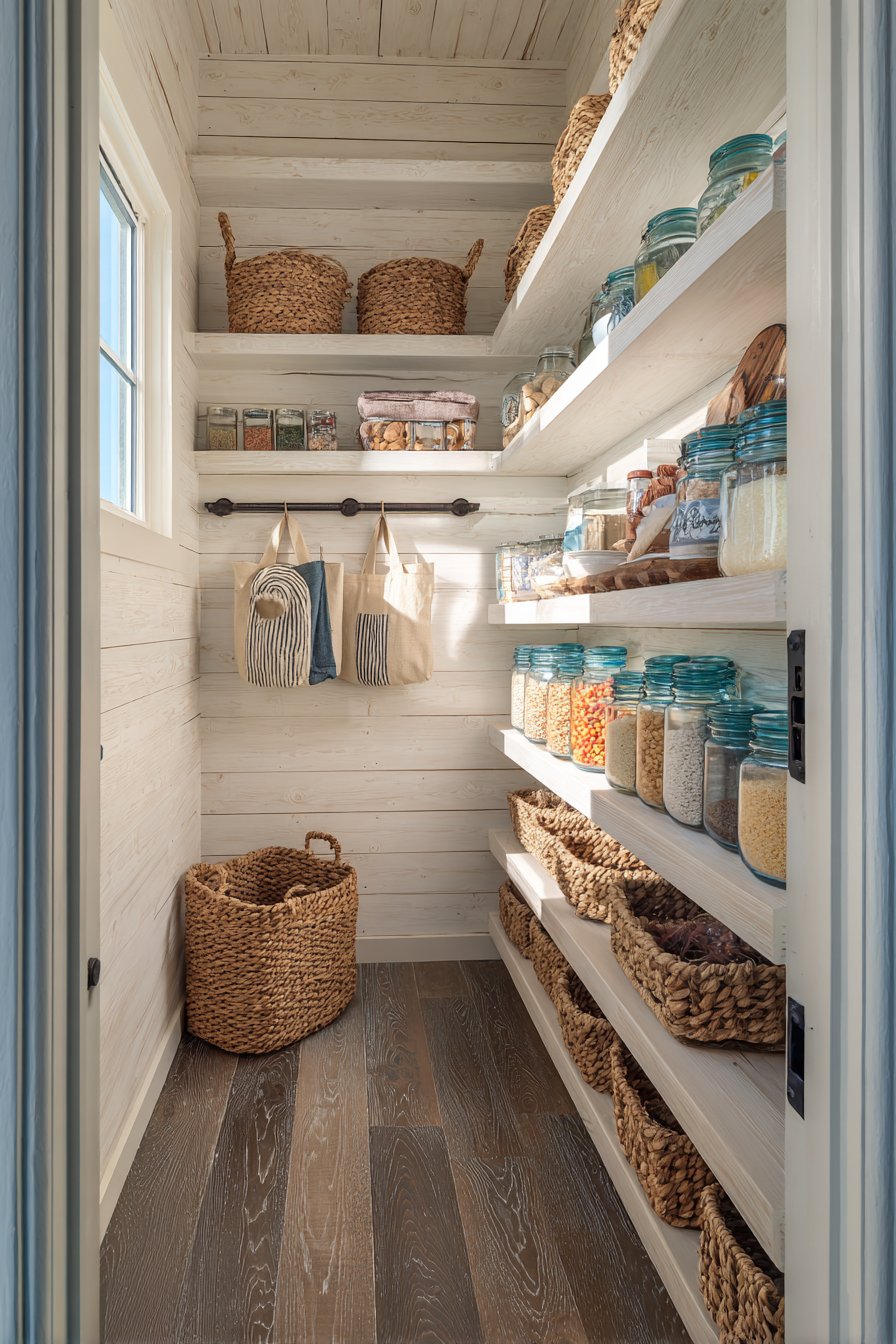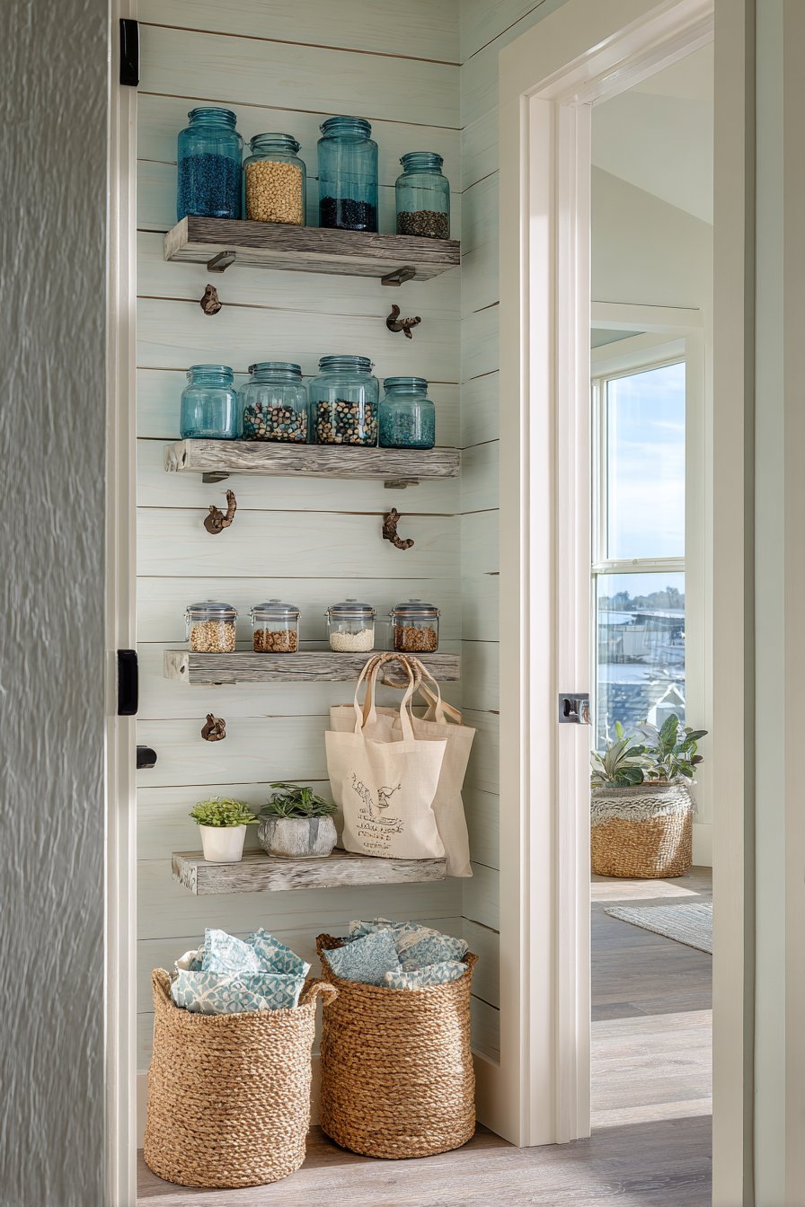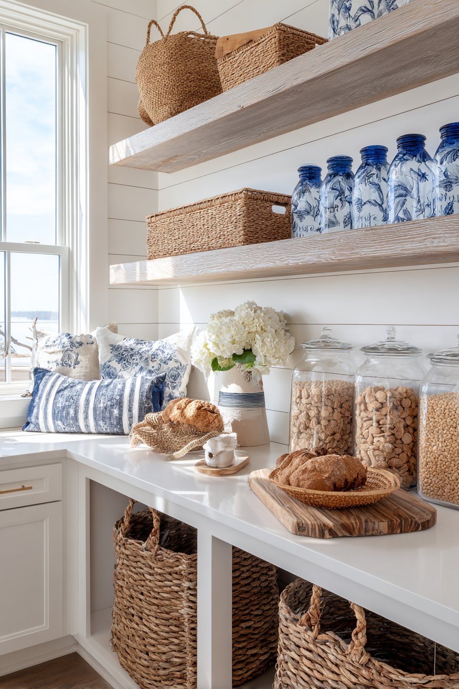 Whitewashed shiplap walls establish coastal charm in this refreshing pantry makeover. Floating shelves in driftwood finish complement the beach-inspired aesthetic perfectly. Wicker baskets with rope handles organize linens and table accessories naturally. Blue glass storage jars add oceanic color while displaying grains and cereals.