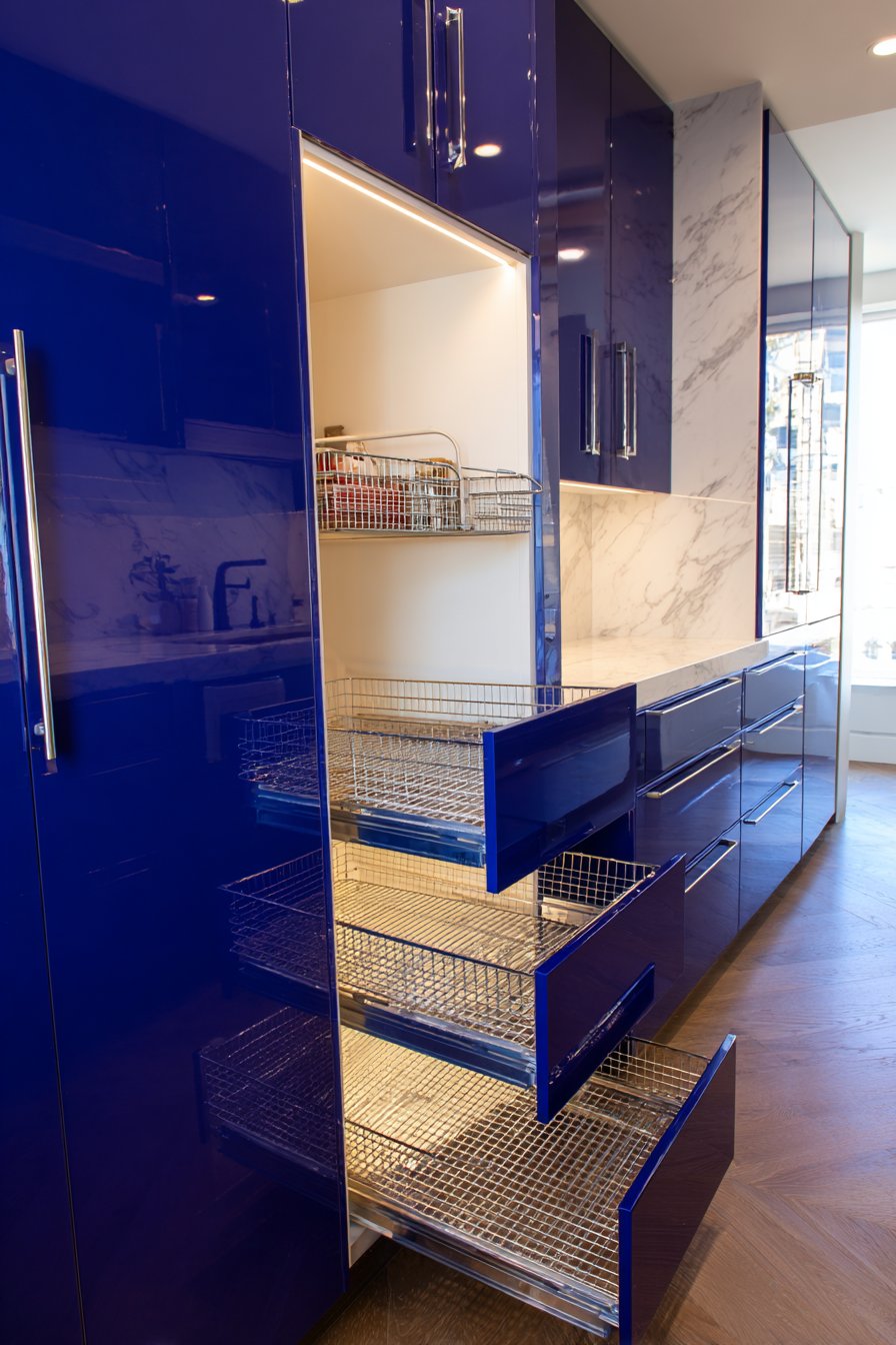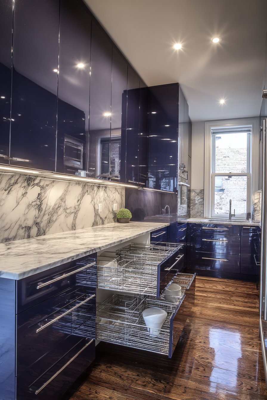 Handleless push-to-open cabinets in high-gloss navy blue lacquer create contemporary sophistication. The deep color makes bold statement while remaining surprisingly versatile. Pull-out pantry units with chrome wire baskets provide full extension access to stored items. This mechanism ensures nothing gets lost in deep cabinet spaces.