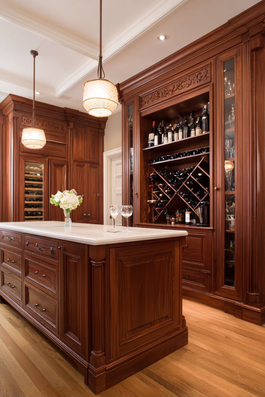 Touch-activated lighting illuminates automatically when doors open for convenience. This smart feature adds modern functionality to traditional craftsmanship. Herringbone pattern wood flooring in a complementary tone adds sophisticated detail. Professional interior photography captures the rich wood grain and marble veining beautifully.