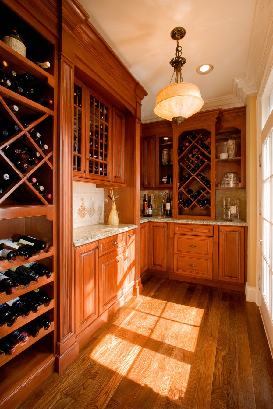 Raised panel cabinetry in warm cherry wood finish brings traditional elegance to this pantry makeover. Oil-rubbed bronze hardware adds classic metallic accents throughout the space. Built-in wine rack stores bottles horizontally for proper aging conditions. Dedicated shelving for small appliances keeps kitchen countertops clear and organized.
