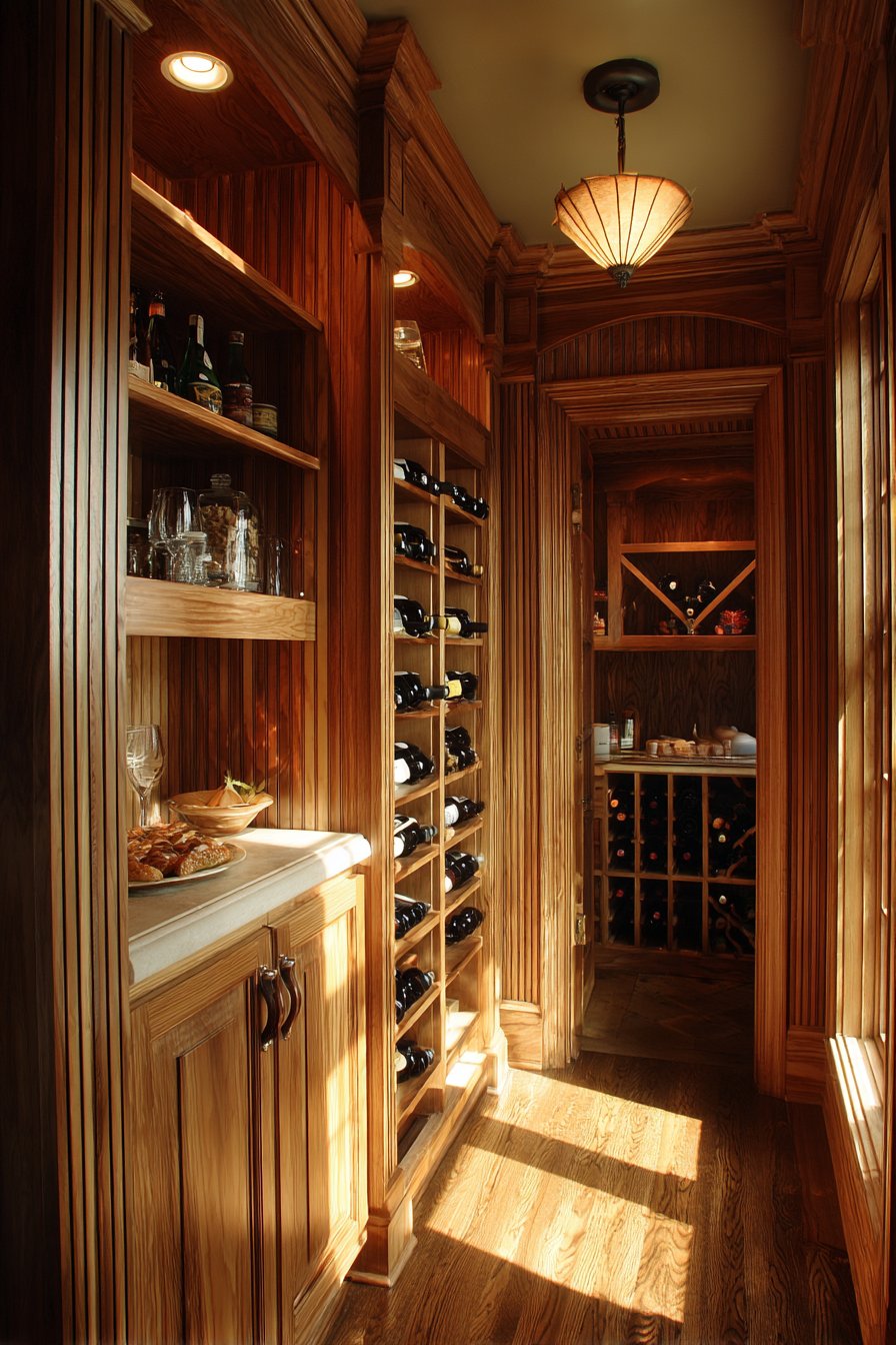 Crown molding and beadboard backing add architectural detail and refinement. These traditional elements create custom millwork appearance within the pantry space. Pendant light fixture with fabric shade provides warm ambient lighting. Wide-angle interior photography emphasizes the classic woodwork with natural highlighting.