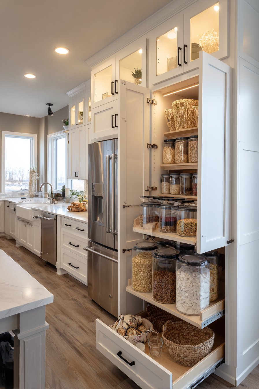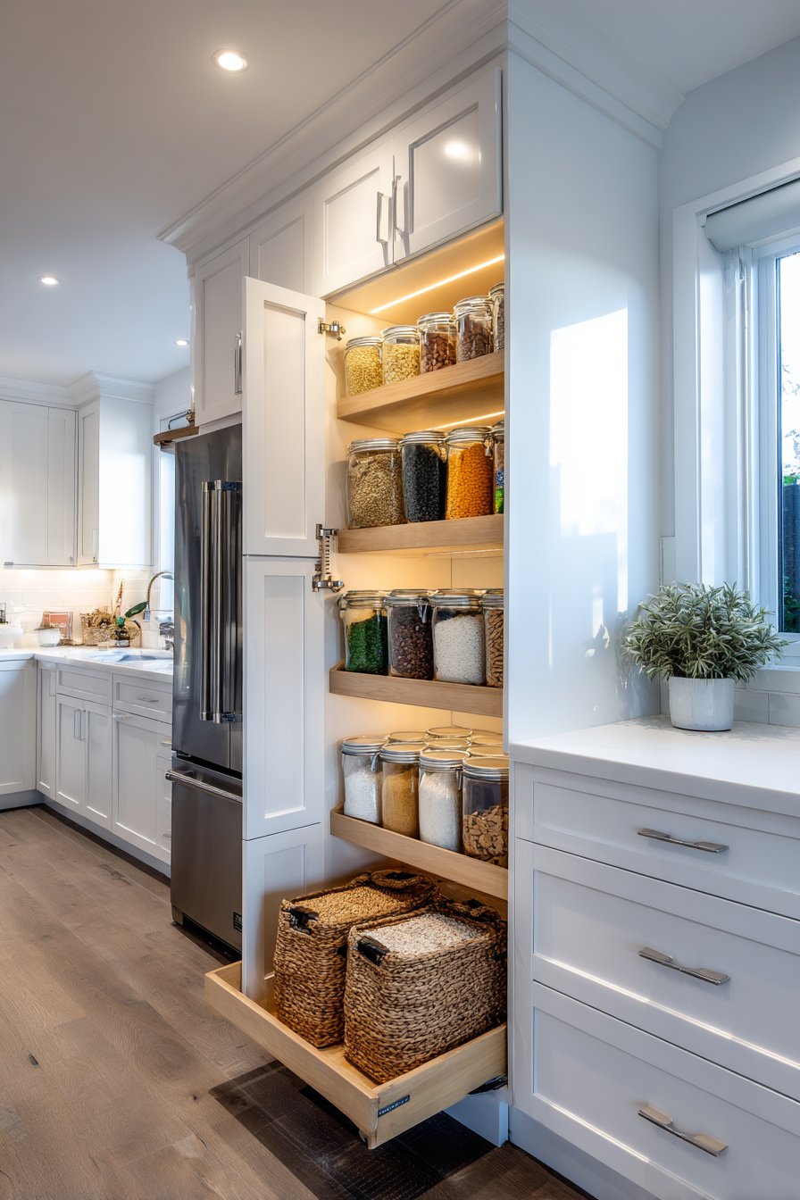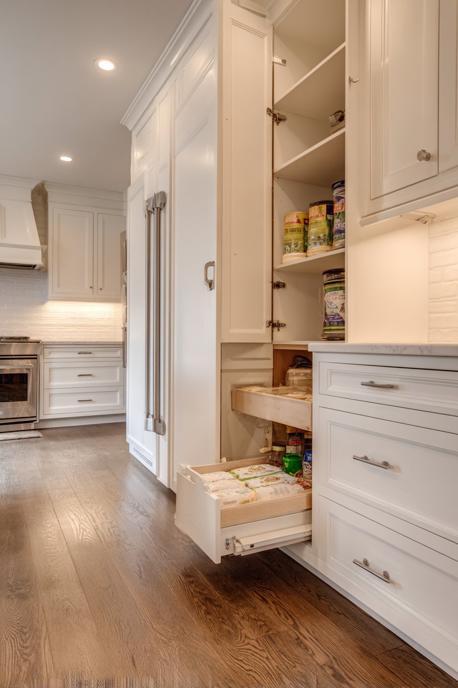 A floor-to-ceiling pull out pantry cabinet anchors this modern kitchen design. Crisp white shaker-style cabinetry creates timeless appeal that never goes out of fashion. The cabinet integrates seamlessly between the refrigerator and main counter run. Brushed nickel hardware adds subtle sophistication to the clean lines.