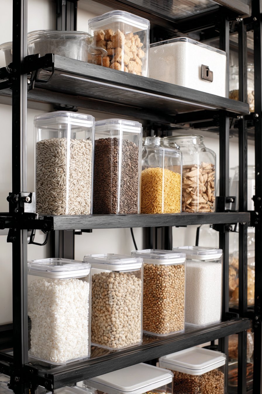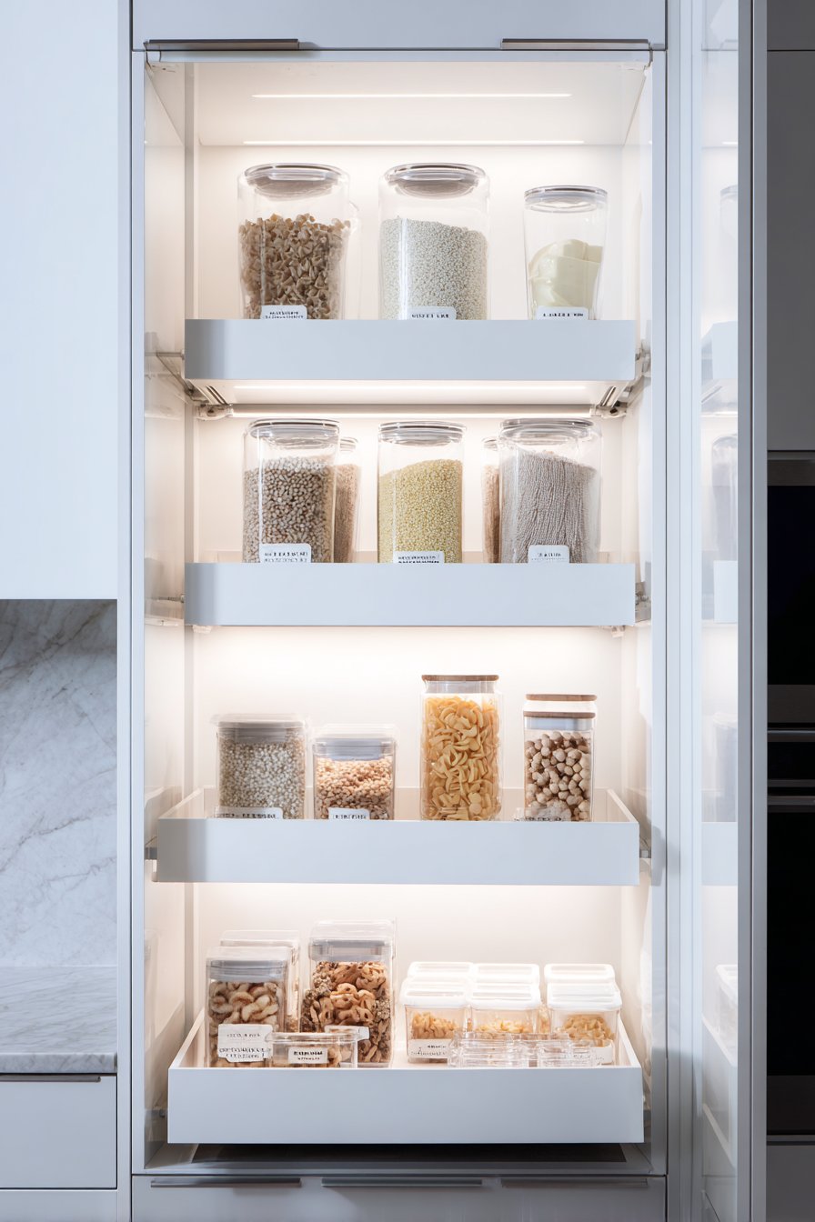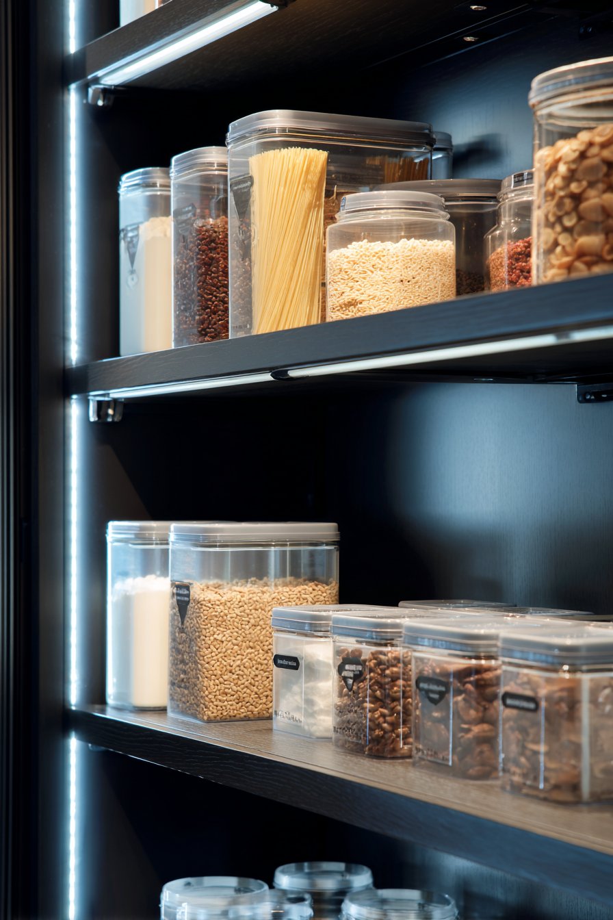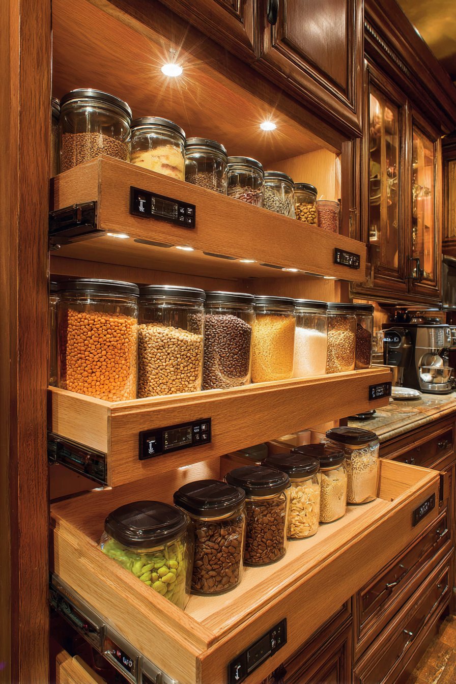 Pull-out shelves position at ergonomic heights for comfortable access. Integrated pest-deterrent design features protect food supplies. Clear acrylic dividers separate dry goods by type. The professional organization rivals commercial kitchen standards.