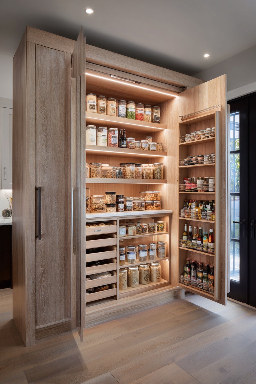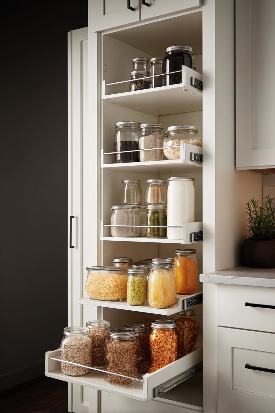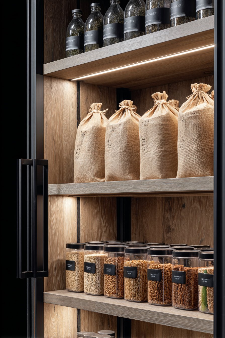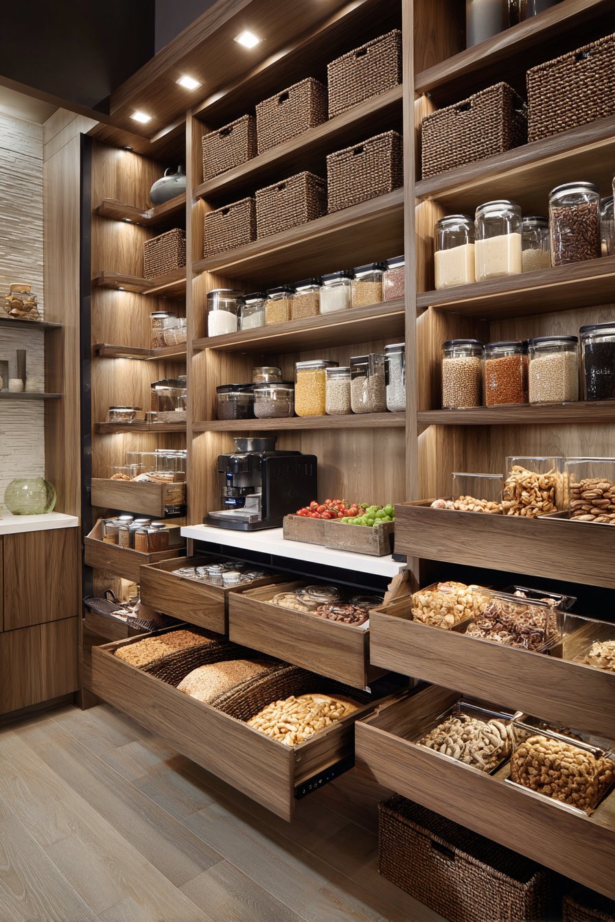 Pull-out shelves position at ergonomic heights for comfortable access. Integrated pest-deterrent design features protect food supplies. Clear acrylic dividers separate dry goods by type. The professional organization rivals commercial kitchen standards.