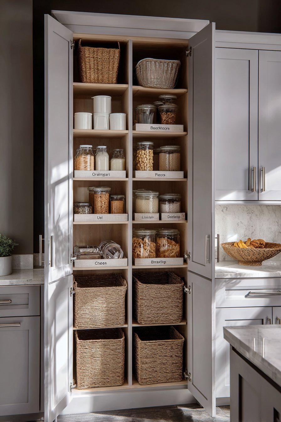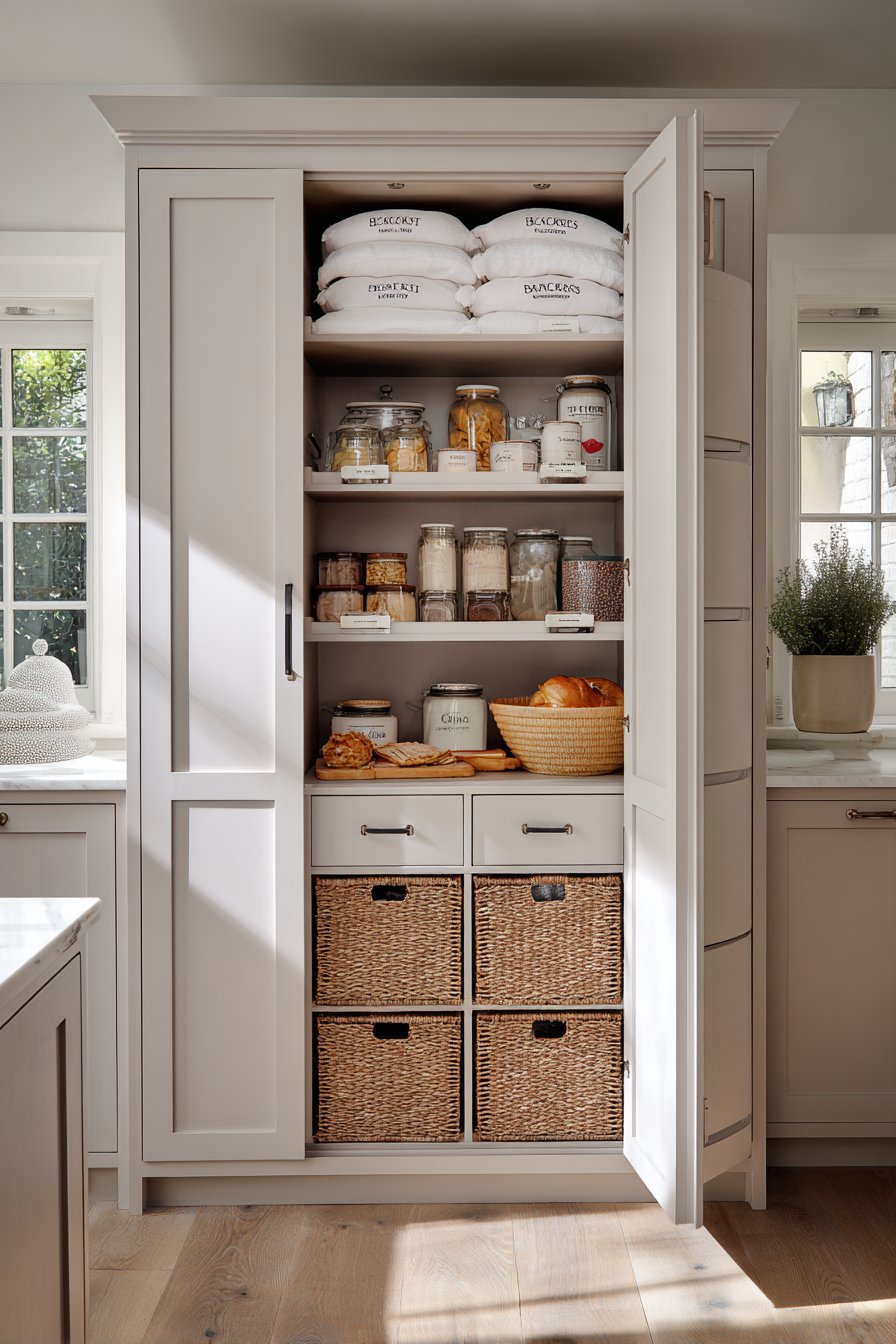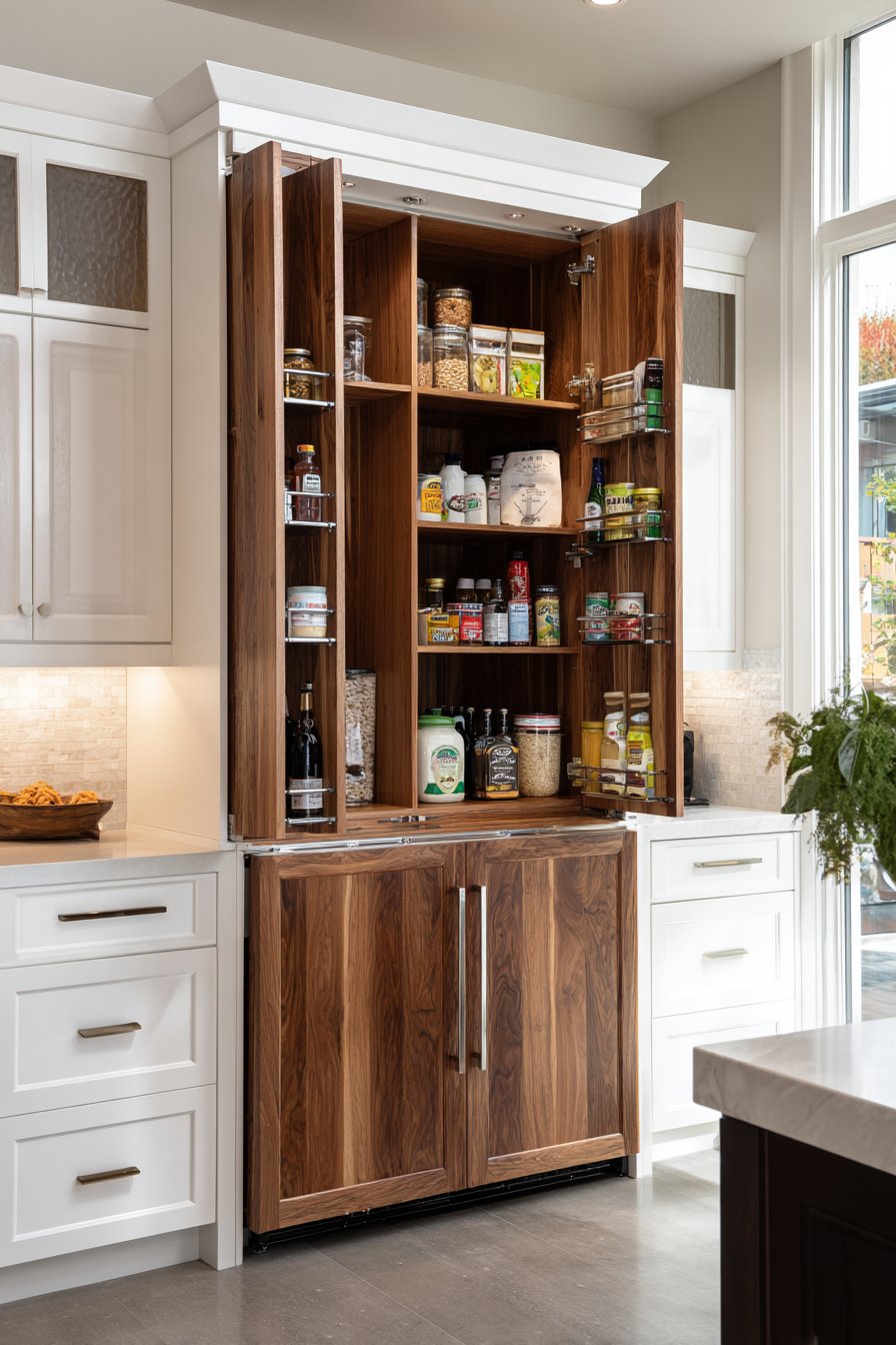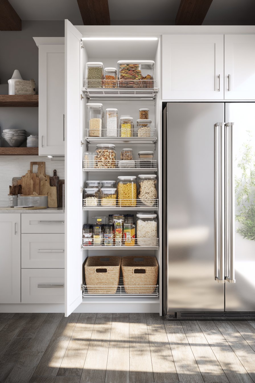 Pull-out shelves position at ergonomic heights for comfortable access. Integrated pest-deterrent design features protect food supplies. Clear acrylic dividers separate dry goods by type. The professional organization rivals commercial kitchen standards.