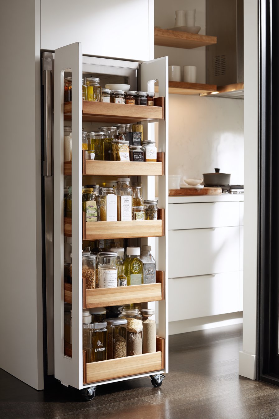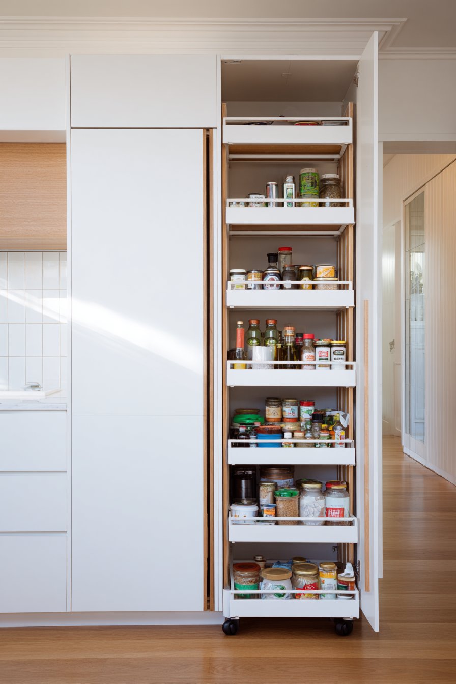 The tiered arrangement keeps everything accessible and visible simultaneously. Items stored at the back remain within easy reach. Morning light emphasizes the space-saving functionality beautifully. Quality hardware proves that slim doesn’t mean flimsy construction.