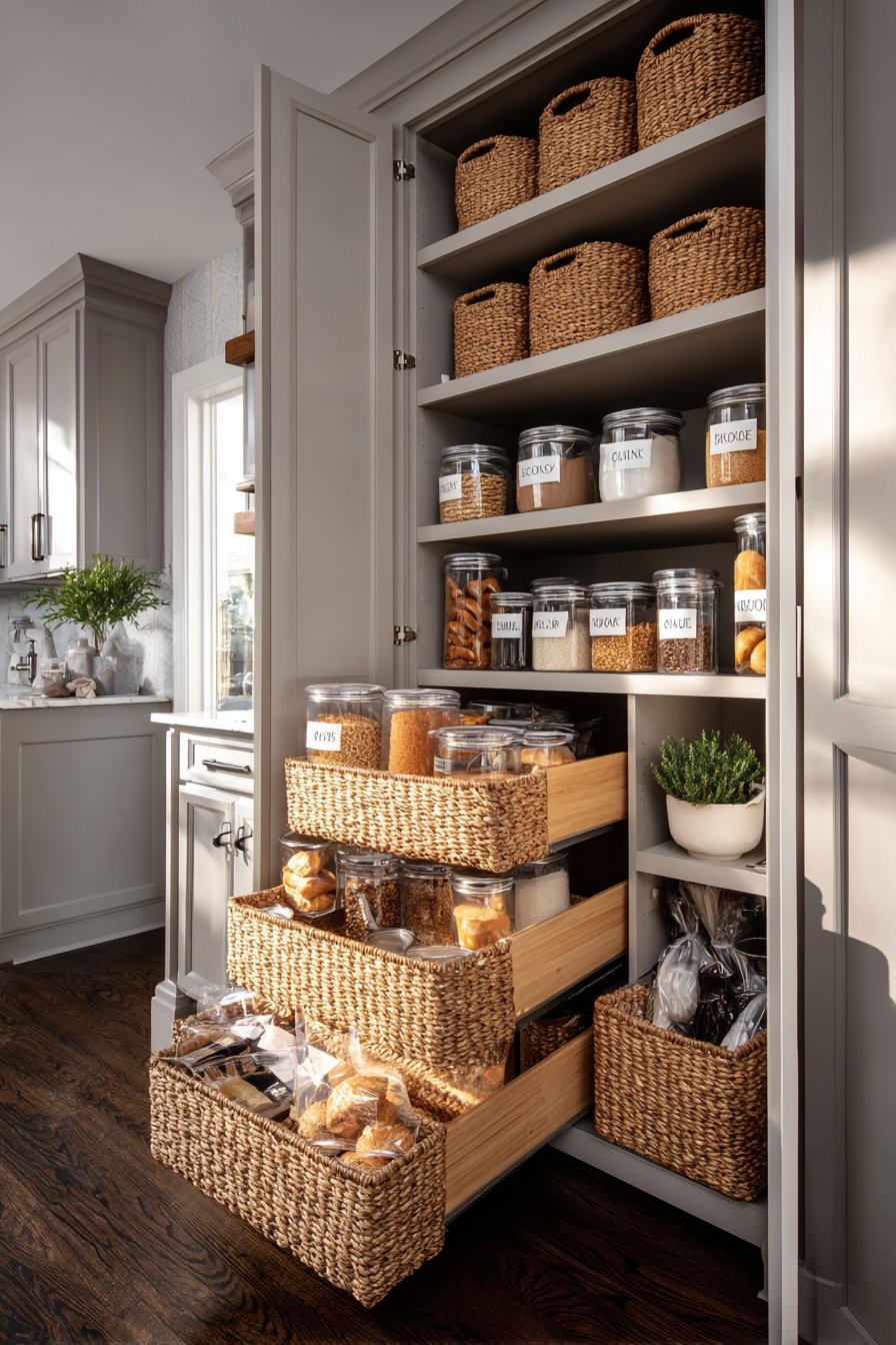 Organized dry goods fill the shelves in beautiful uniformity. Glass containers showcase pasta, grains, and baking supplies clearly. Woven baskets on lower shelves contain snacks and produce attractively. The transparent storage allows quick inventory checks at a glance.