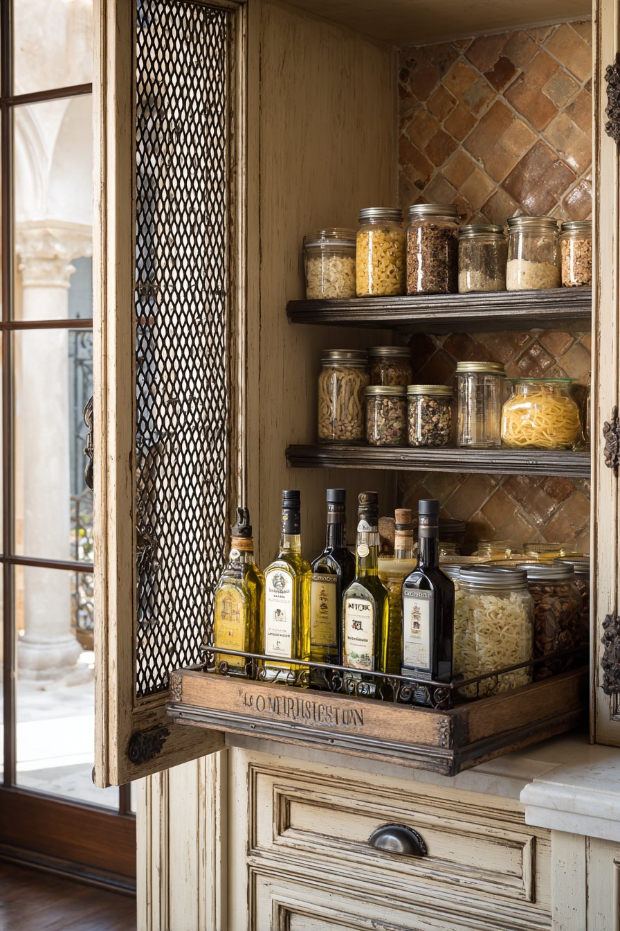 European-inspired design brings Old World romance to kitchen storage. Distressed cream-colored cabinetry suggests centuries of family use. Wrought iron shelf supports visible through decorative metal mesh panels. Terracotta tile backsplash panel adds authentic Mediterranean color.
