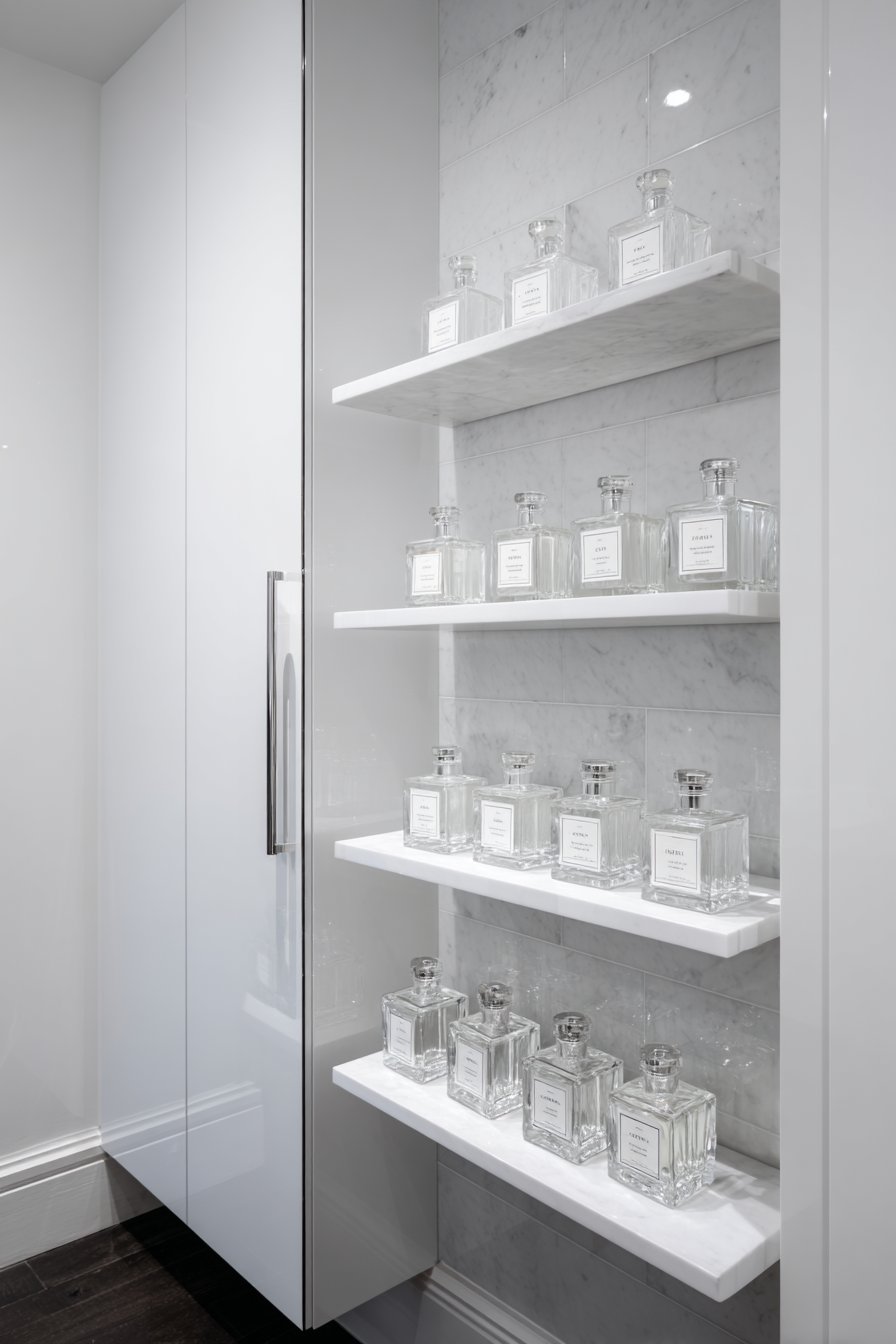 - Select acrylic shelving for floating visual effect