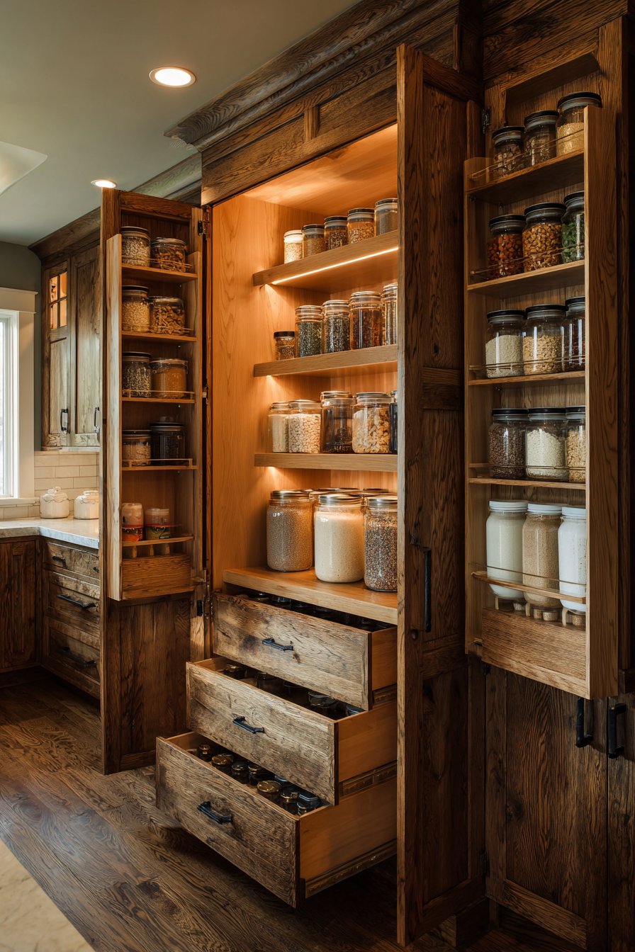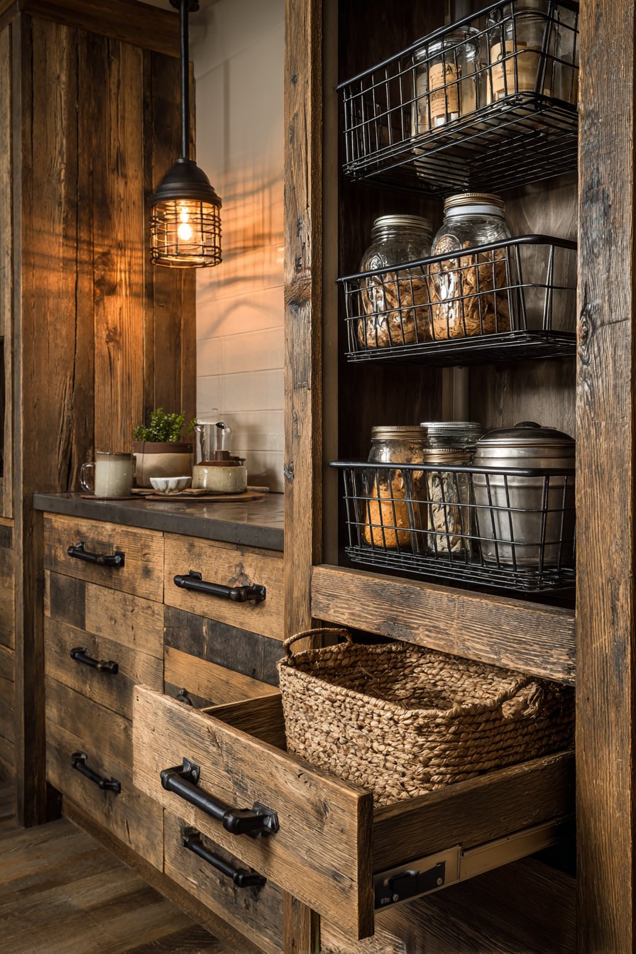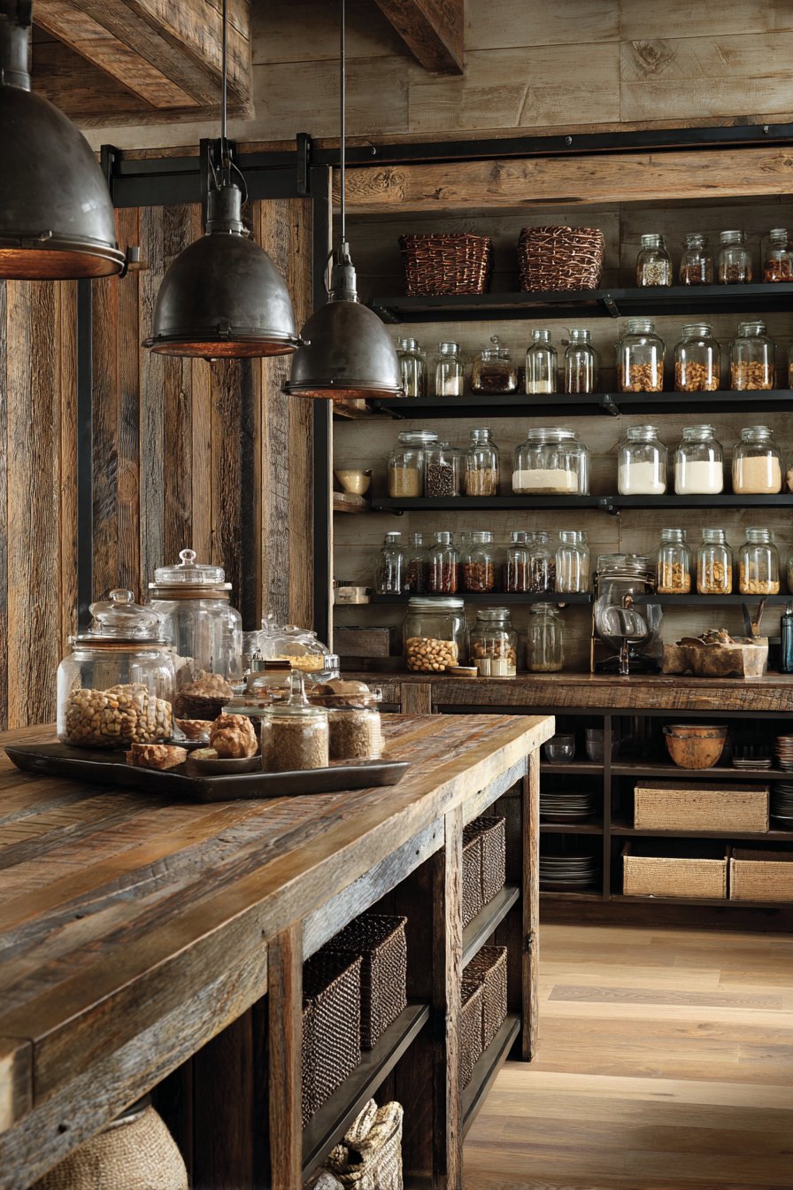 The pantry maintains original wood character while incorporating modern hardware. Soft-close mechanisms operate silently despite rustic appearance. Mason jars, vintage-style canisters, and woven baskets organize supplies. Warm pendant lighting illuminates the textural materials beautifully.