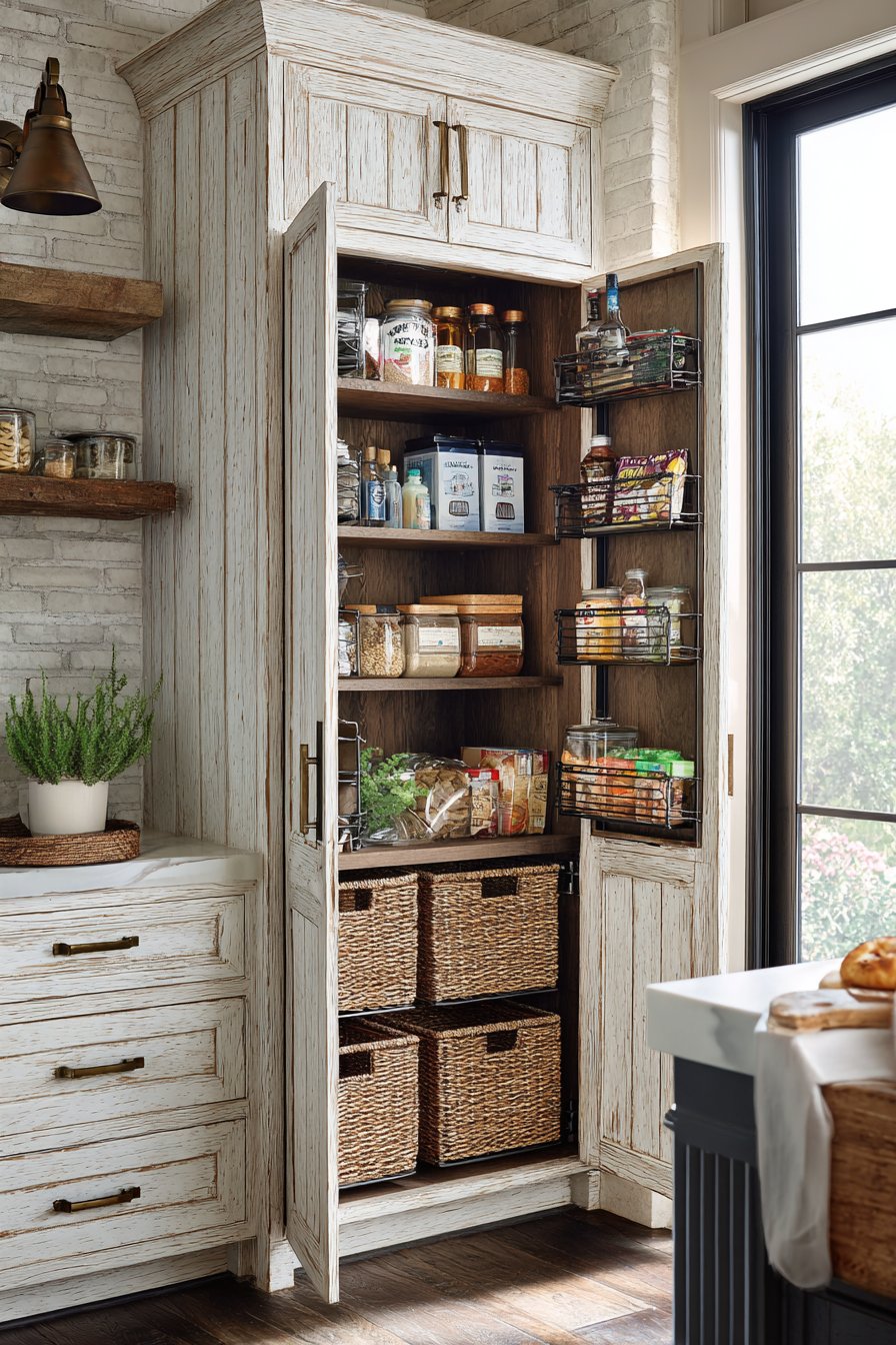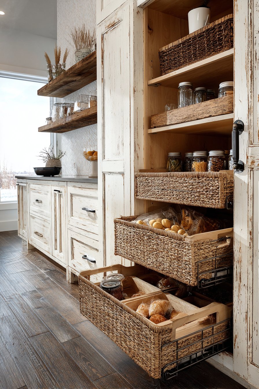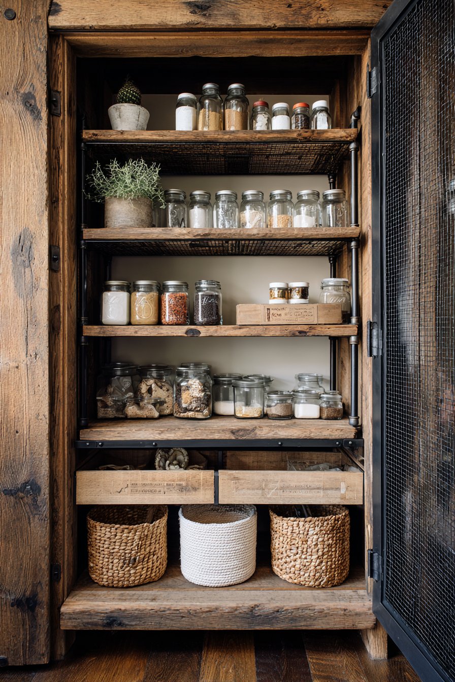 The pantry maintains original wood character while incorporating modern hardware. Soft-close mechanisms operate silently despite rustic appearance. Mason jars, vintage-style canisters, and woven baskets organize supplies. Warm pendant lighting illuminates the textural materials beautifully.