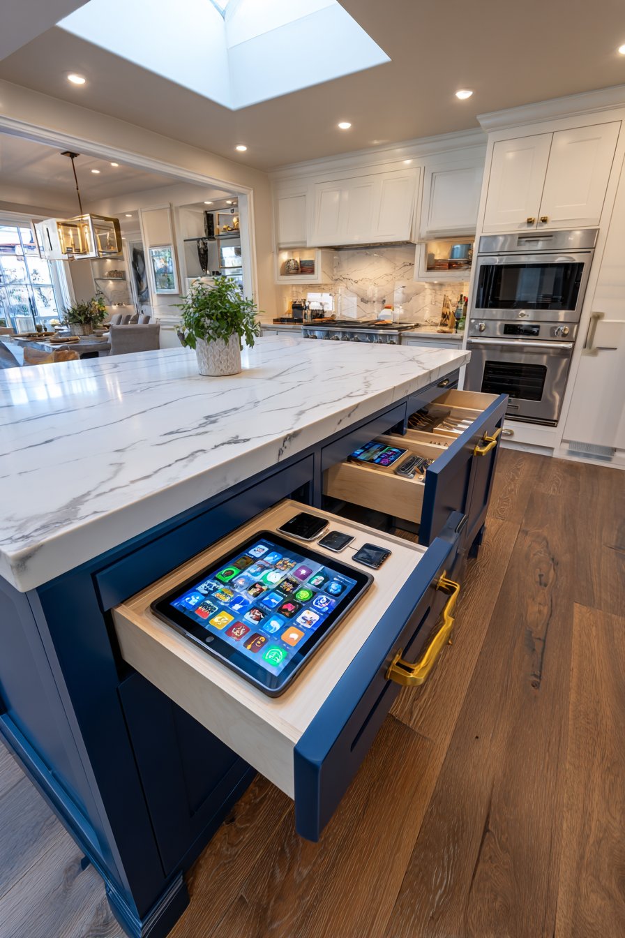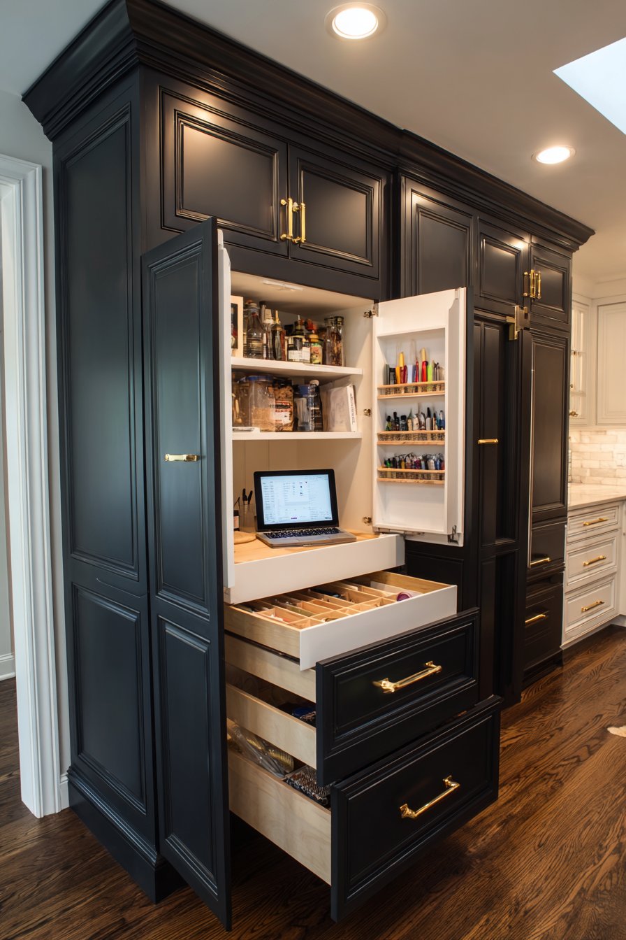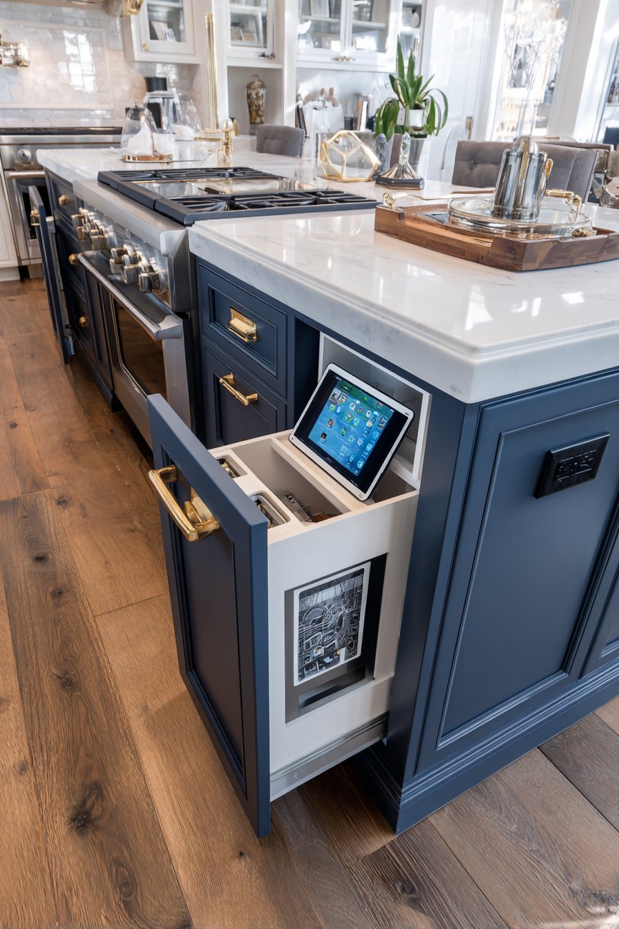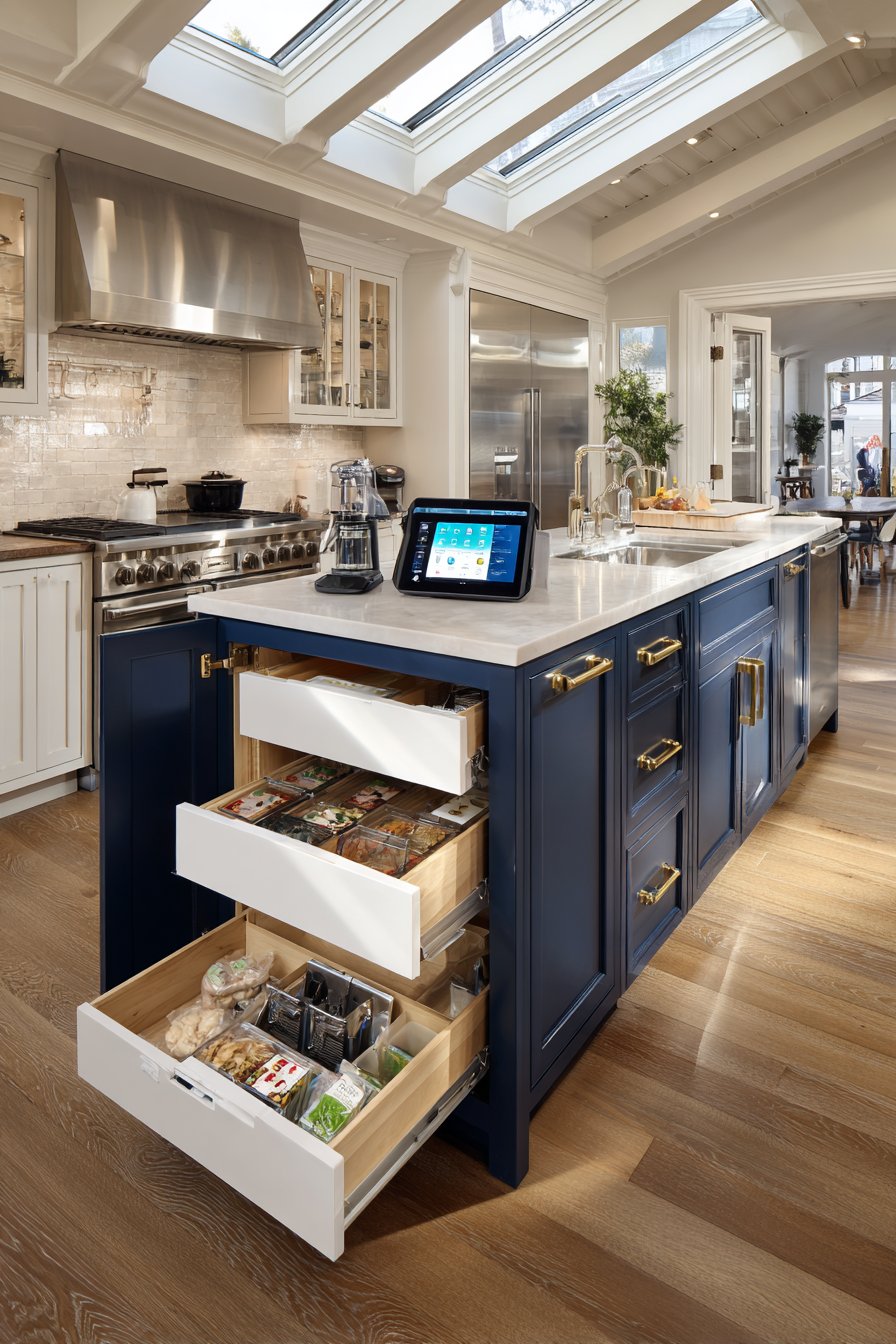 This design works brilliantly in open-concept kitchen layouts. The navy cabinetry anchors the island visually. Brass hardware coordinates with other kitchen fixtures. Dual access improves workflow efficiency during meal preparation.