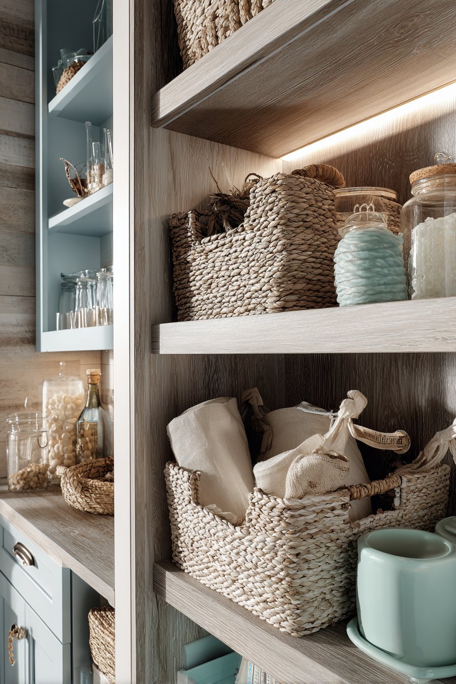 - Display coastal pottery, shells, or beach finds on open shelves
