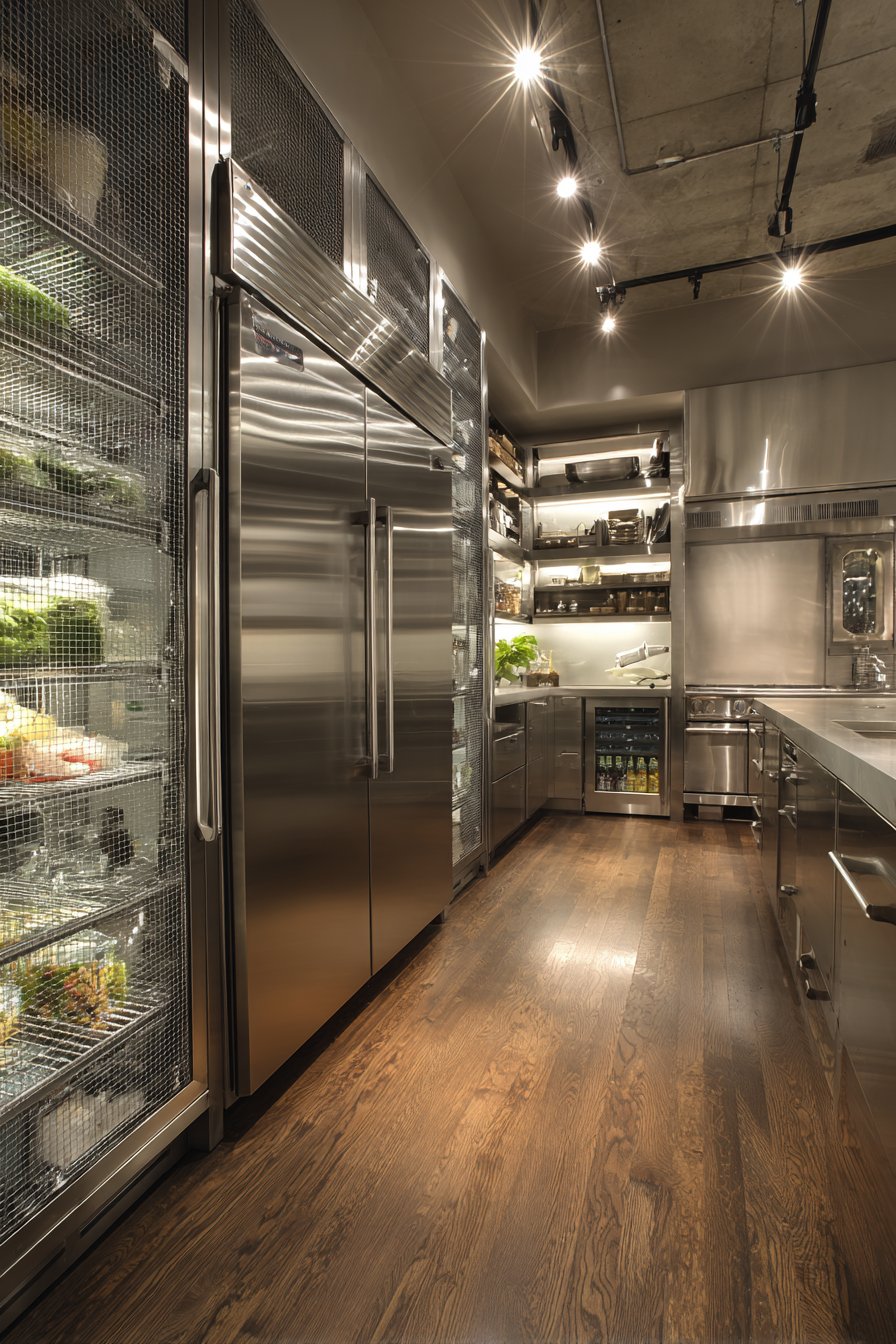 This pantry suits culinary enthusiasts and professional chefs alike. The industrial aesthetic celebrates food preparation seriously. Commercial-grade components ensure decades of reliable performance. Professional storage elevates home cooking capabilities significantly.