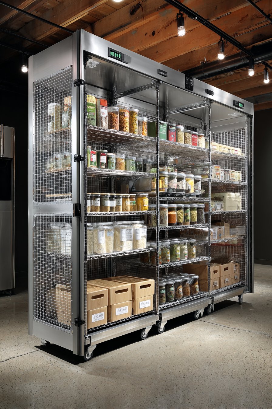 Serious home cooks deserve professional-quality storage solutions. Commercial stainless steel construction provides restaurant durability. Perforated shelving allows air circulation around stored goods. Temperature and humidity monitoring ensure optimal storage conditions.