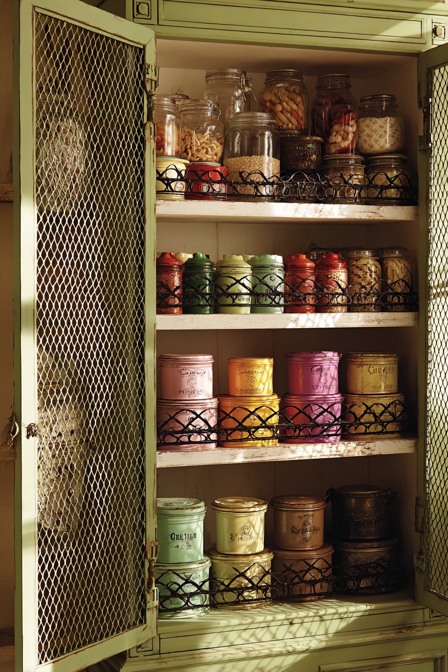 - Use chicken wire or metal mesh for vintage cabinet door panels