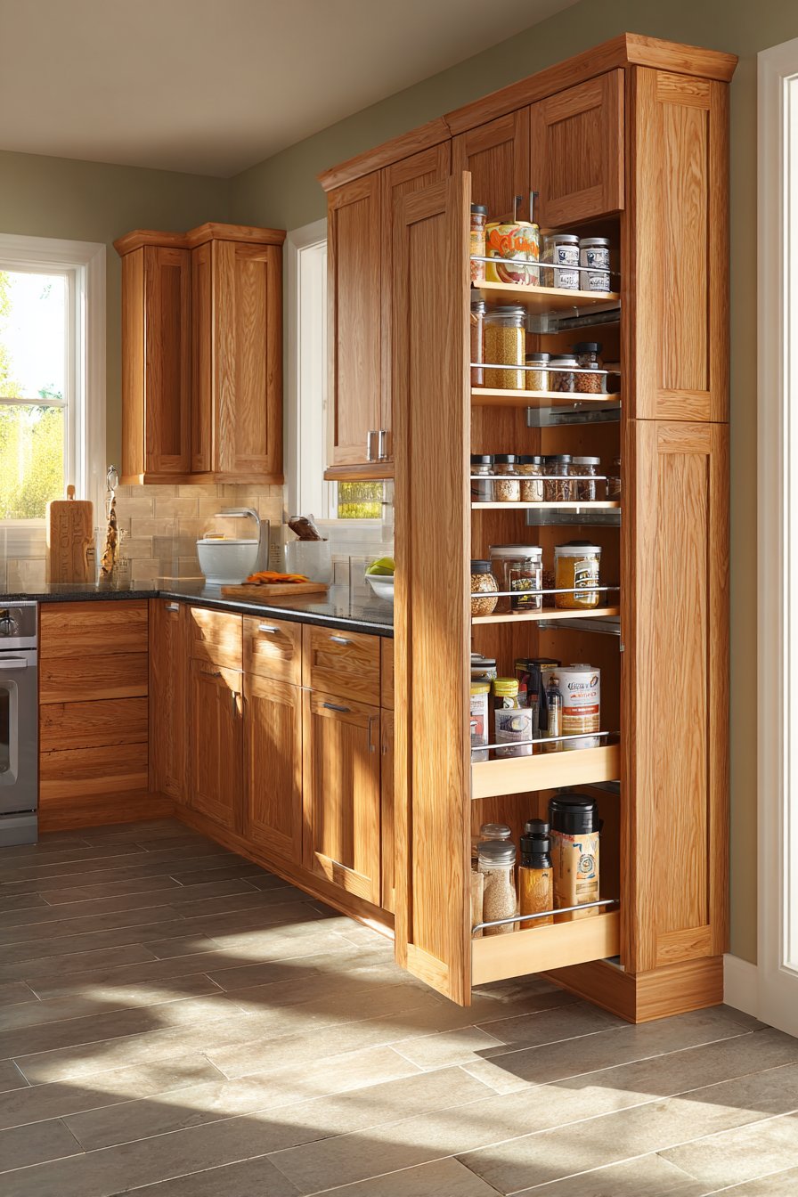 This design solves the awkward gap problem many kitchens face. The narrow footprint transforms wasted space into valuable storage. Professional installation ensures the mechanism operates smoothly under regular use. The result proves that every inch counts in kitchen planning.