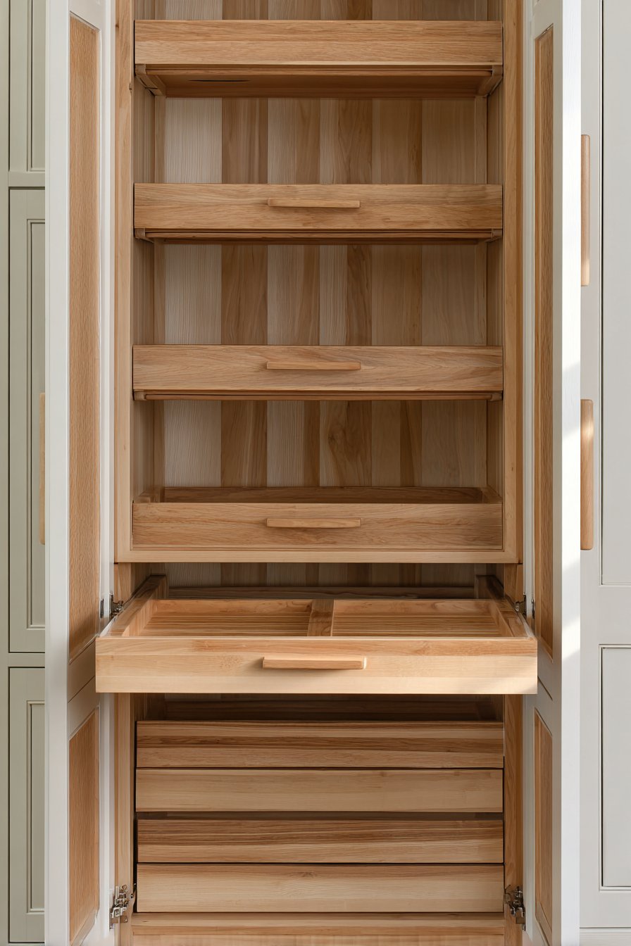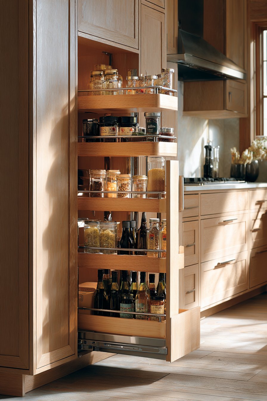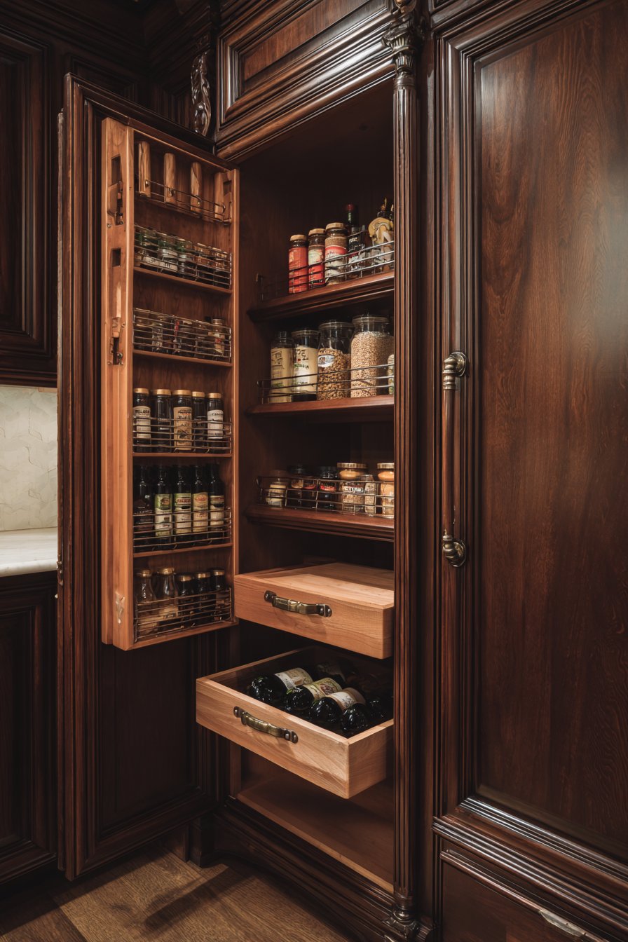 Professional home cooks require pantry systems that match their culinary ambitions. This luxury pull out cabinet uses quarter-sawn white oak construction. Custom dividers separate different ingredient categories methodically. Pull-out drawers at varying heights accommodate items of all sizes.