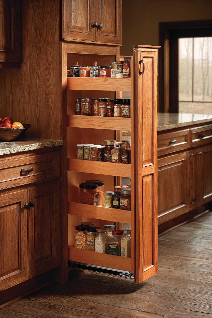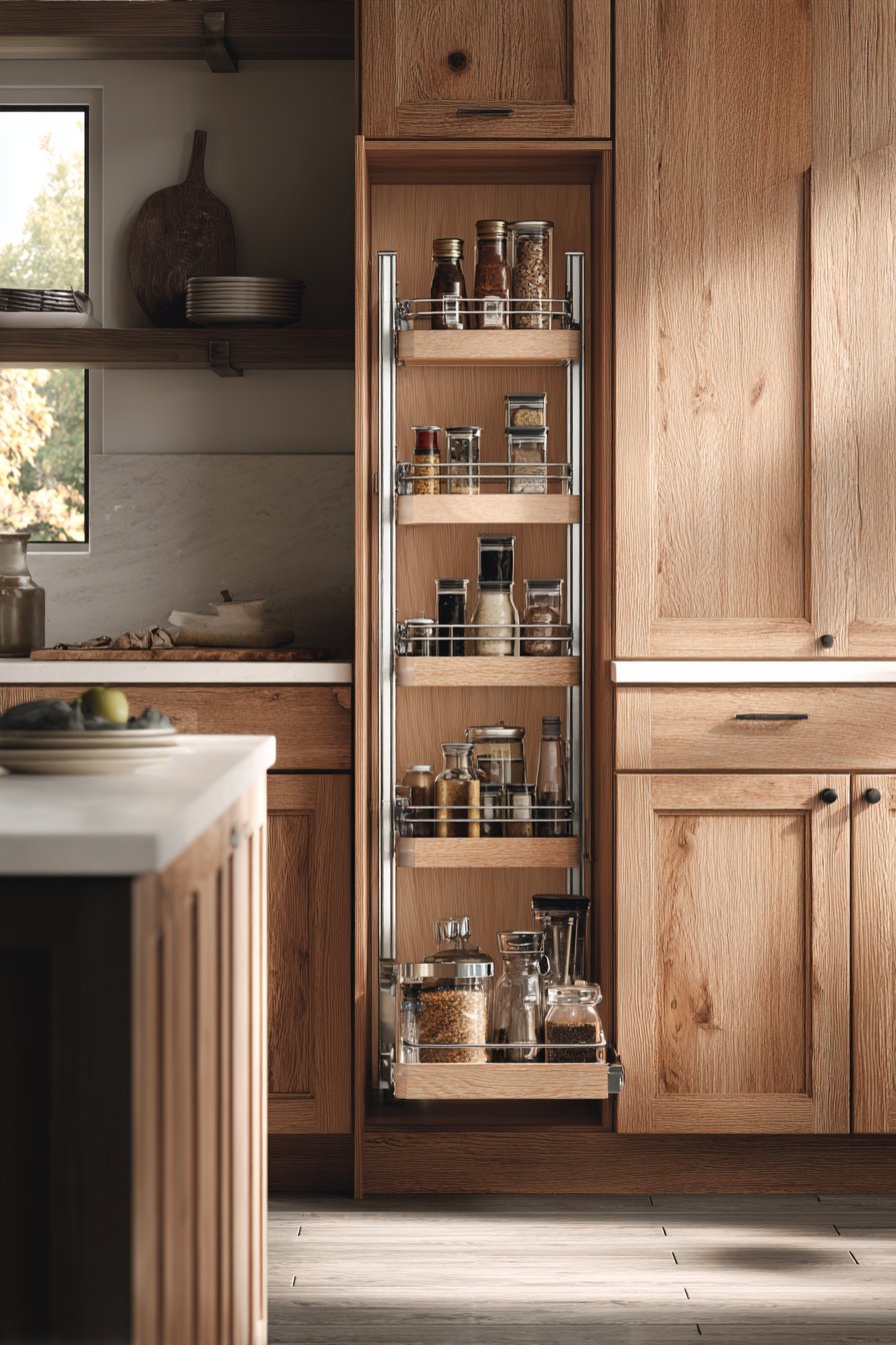 Warm honey oak finish coordinates with the surrounding cabinetry seamlessly. The natural wood grain adds warmth to the kitchen environment. Chrome pull-out mechanisms ensure smooth operation despite the narrow width. Spice jars, oil bottles, and canned goods stand in clear view.