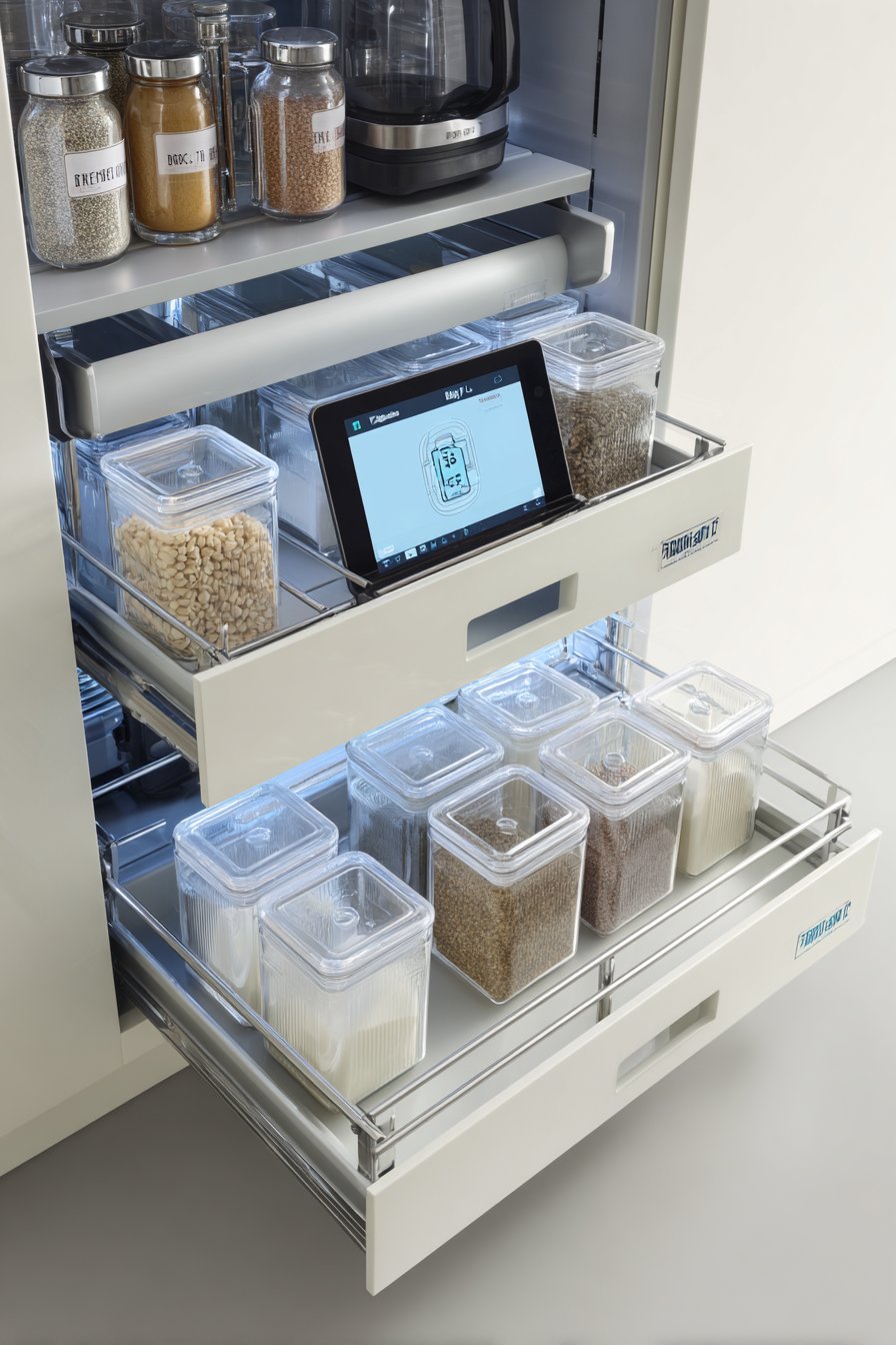Professional interior photography captures the modern convenience features. Balanced lighting emphasizes the blend of technology and practicality. Labeled clear containers maintain visual order systematically. Clean contemporary aesthetic celebrates functional innovation.
