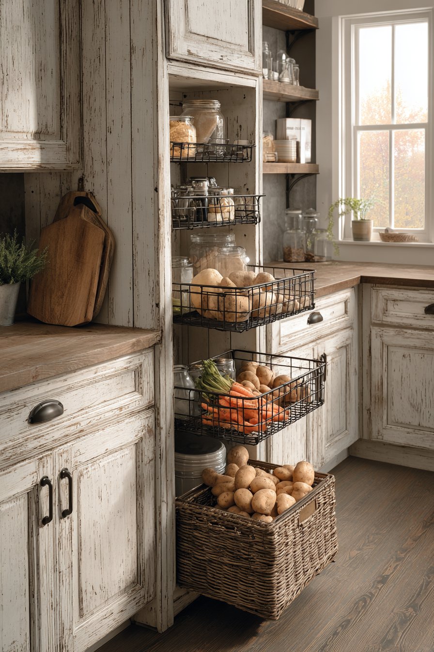 The practical storage solution doesn’t sacrifice style for function admirably. Wicker baskets add textural interest to the white backdrop. Root vegetables breathe in the natural fiber containers. The farmhouse aesthetic creates warmth and welcoming energy.