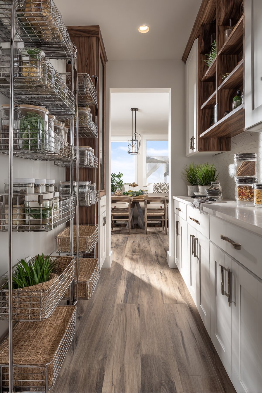 The kitchen side features white painted cabinetry with practical chrome wire shelving. Everyday groceries occupy this frequently accessed storage area. The dining side showcases stained walnut with decorative glass panel inserts. Entertaining supplies and special occasion items reside here.