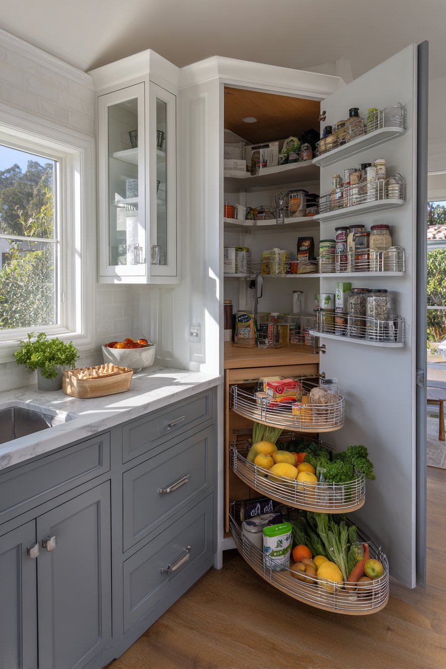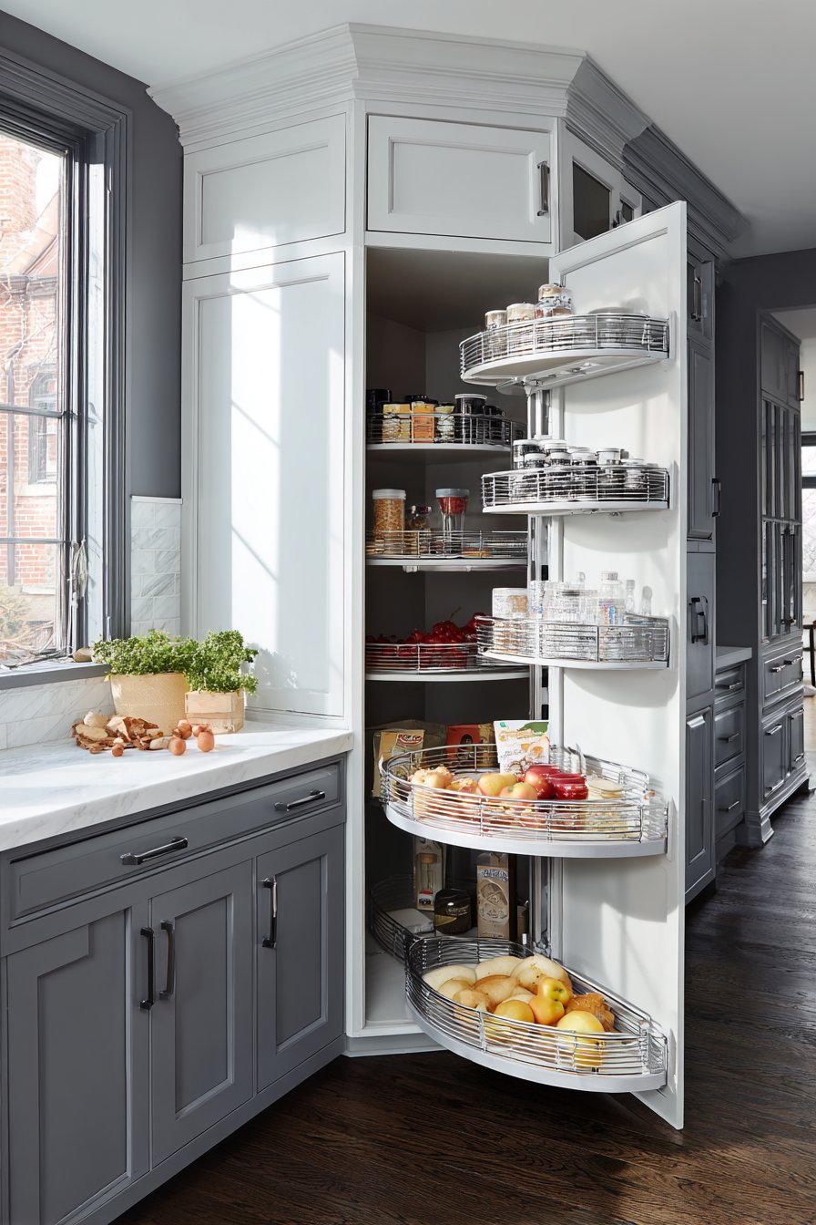 Awkward corner spaces typically waste valuable kitchen storage potential. This innovative pull out pantry conquers the diagonal challenge creatively. Custom lazy-Susan-style rotation combines with pull-out shelves ingeniously. The mechanism transforms dead space into accessible storage.