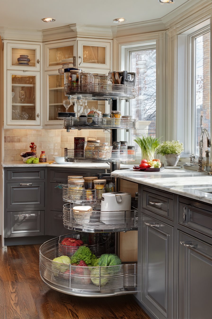 Chrome wire baskets hold produce and packaged goods securely. The rotation mechanism brings everything within comfortable reach. Natural daylight streaming from nearby windows highlights the clever engineering. The innovative design maximizes typically wasted diagonal areas.