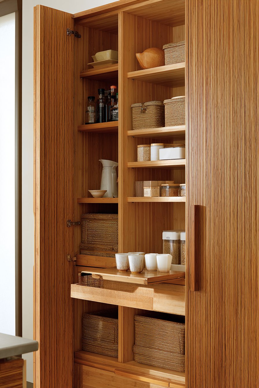 Clean-lined adjustable bamboo shelving provides sustainable storage solutions. Natural fiber storage boxes organize smaller items discretely. A dedicated coffee station pull-out shelf includes electrical access. Soft white interior paint contrasts with warm wood tones.
