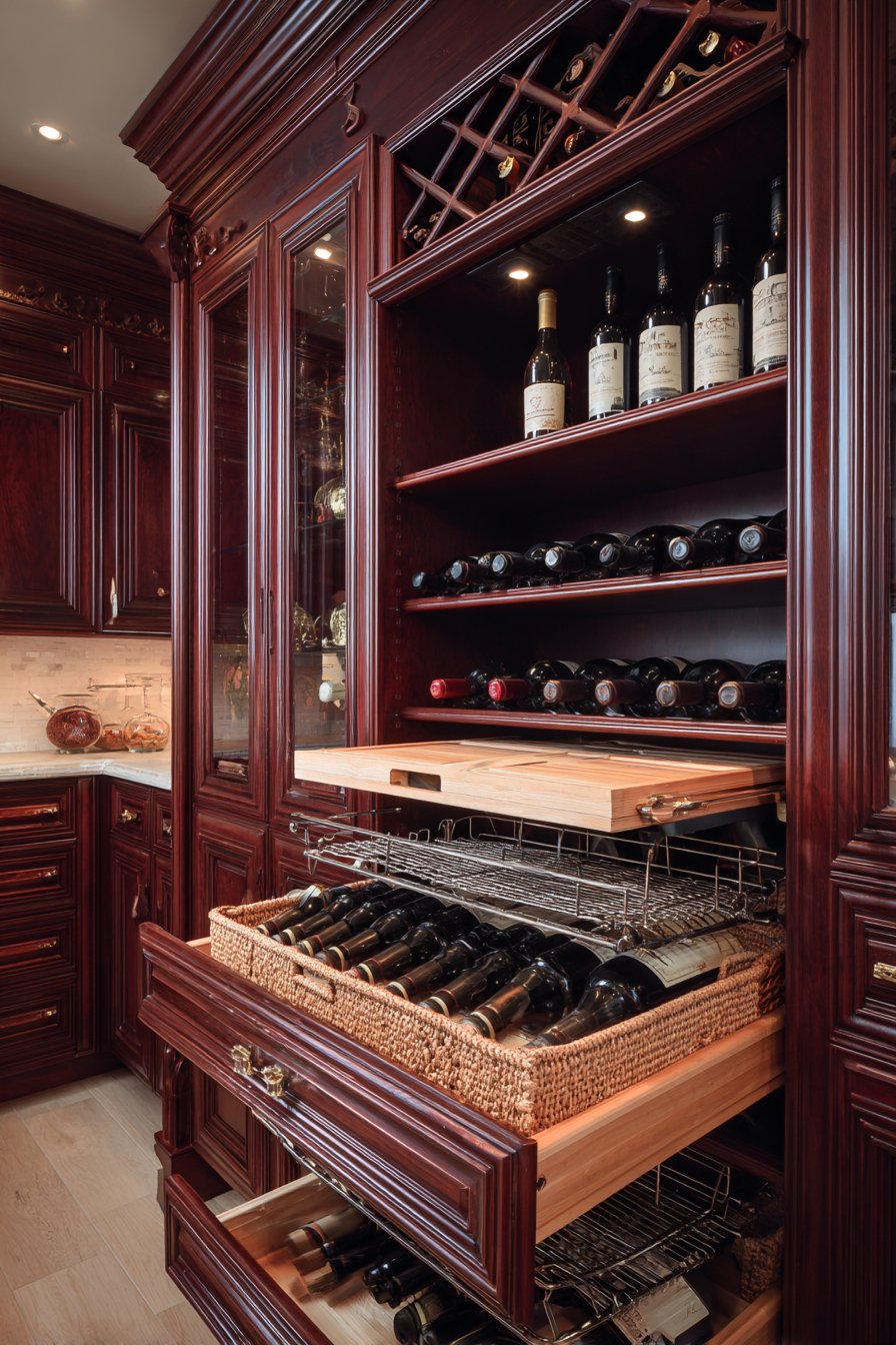Classic elegance defines this traditional pull out pantry design. Raised-panel cherry wood cabinetry showcases masterful craftsmanship throughout. Antique brass hardware adds period-appropriate decorative detail. The rich stain finish highlights natural wood variations beautifully.
