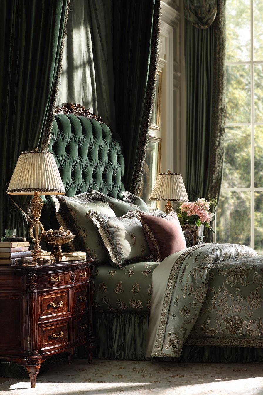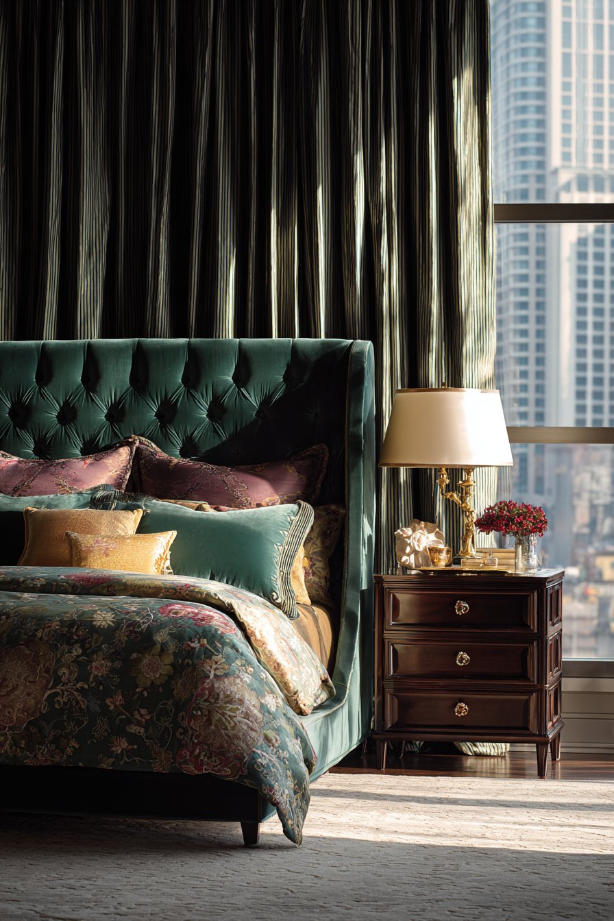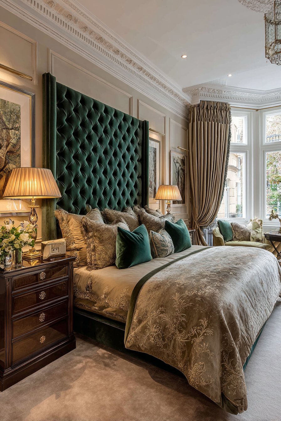 A luxurious bedroom centered on a velvet upholstered king-size bed makes an unforgettable first impression. The deep emerald green tufted headboard extends dramatically toward the ceiling. This vertical emphasis creates grandeur in the space. Silk bedding in complementary jewel tones layers beautifully across the mattress. Multiple decorative pillows feature intricate embroidery that catches the light.