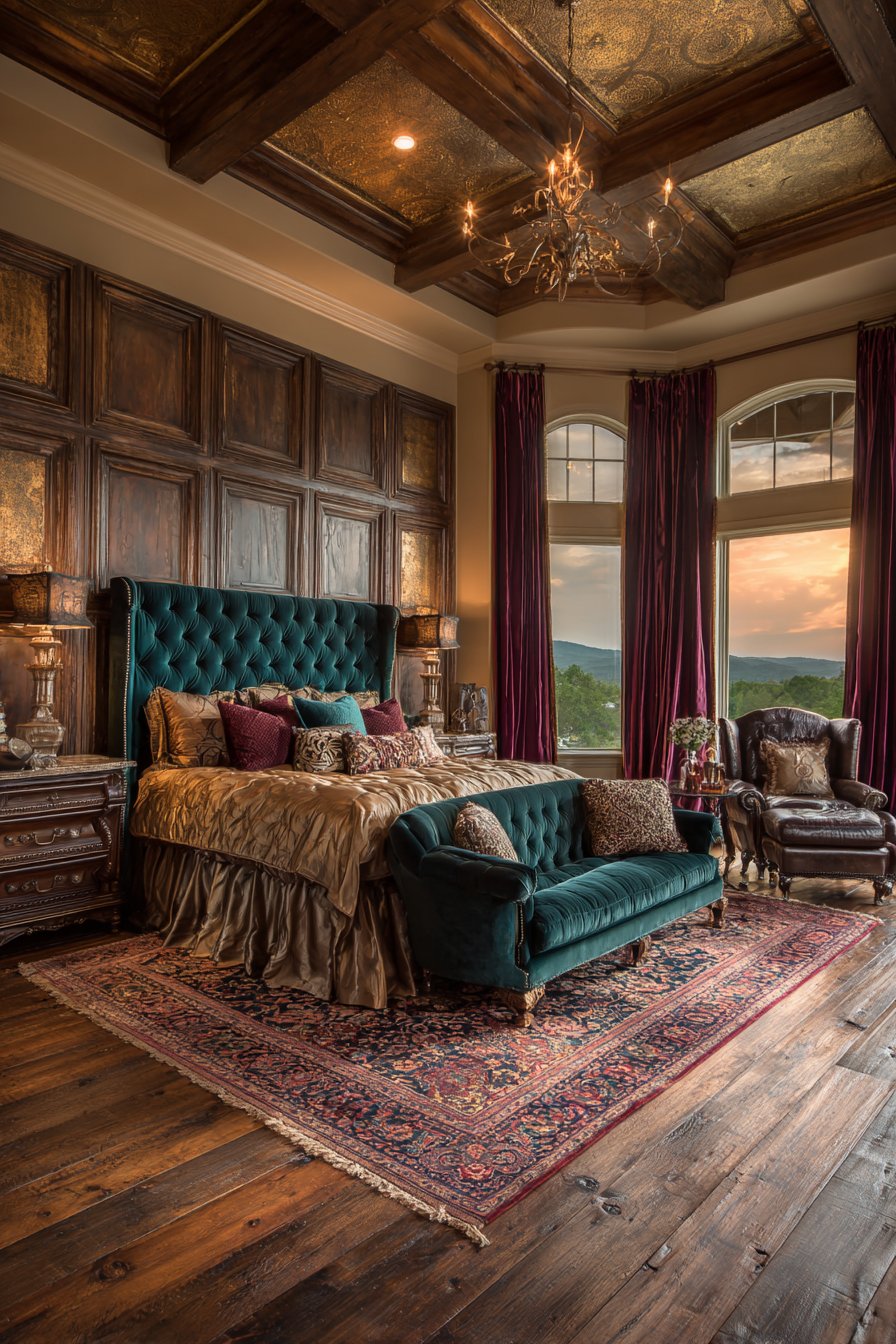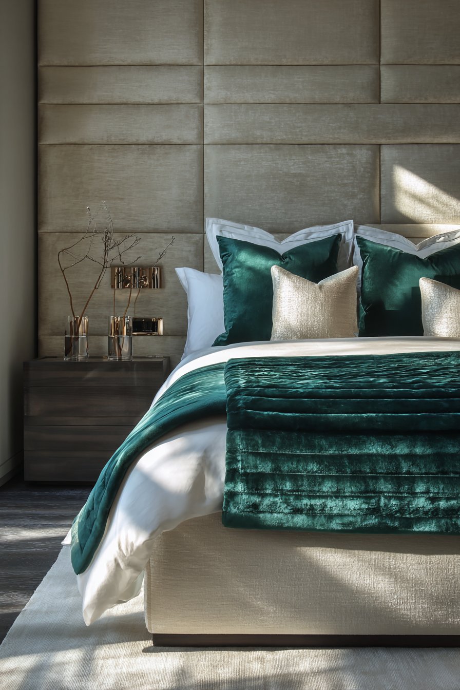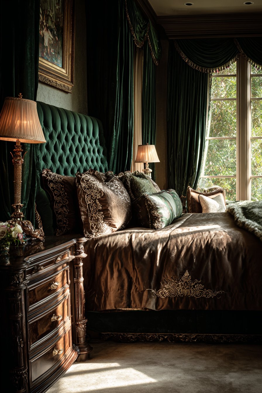 A luxurious bedroom centered on a velvet upholstered king-size bed makes an unforgettable first impression. The deep emerald green tufted headboard extends dramatically toward the ceiling. This vertical emphasis creates grandeur in the space. Silk bedding in complementary jewel tones layers beautifully across the mattress. Multiple decorative pillows feature intricate embroidery that catches the light.
