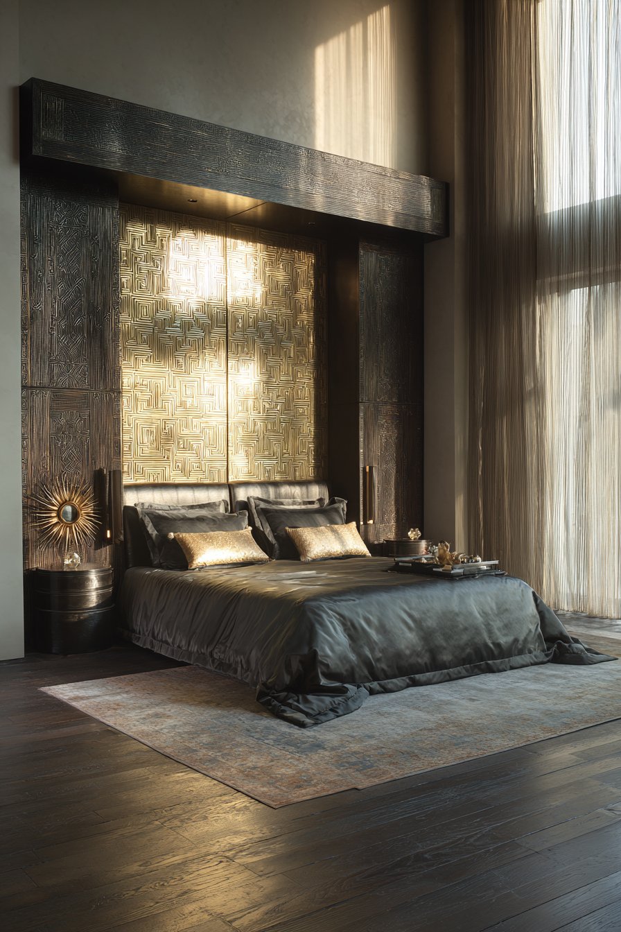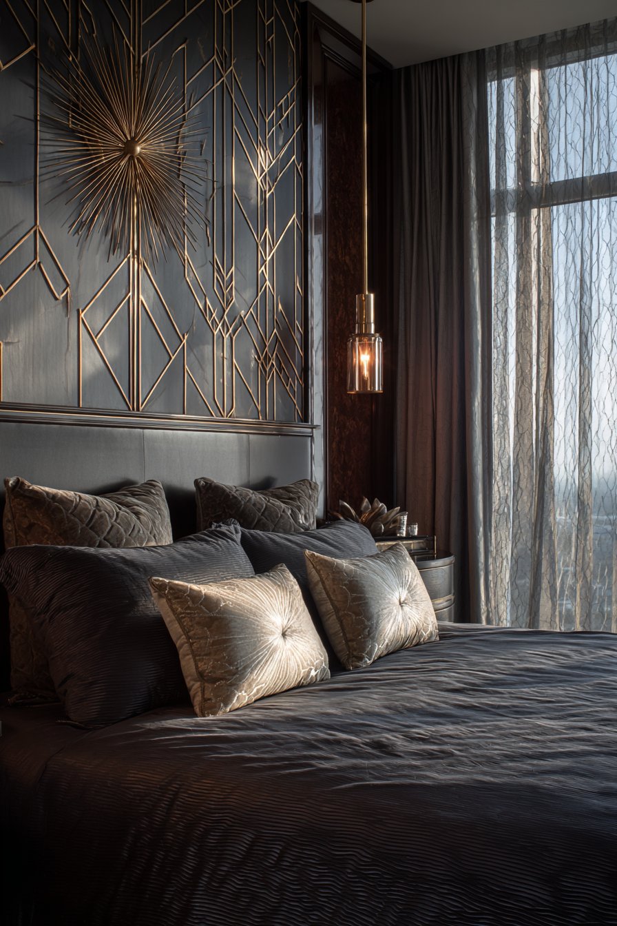 A rich bedroom with Art Deco influences showcases geometric patterned headboard. Brass and ebony inlay creates striking visual contrast. Matching cylindrical bedside tables feature lacquered black finish. Brass hardware provides gleaming accent points. Charcoal silk bedding with champagne accent pillows creates sophisticated palette.