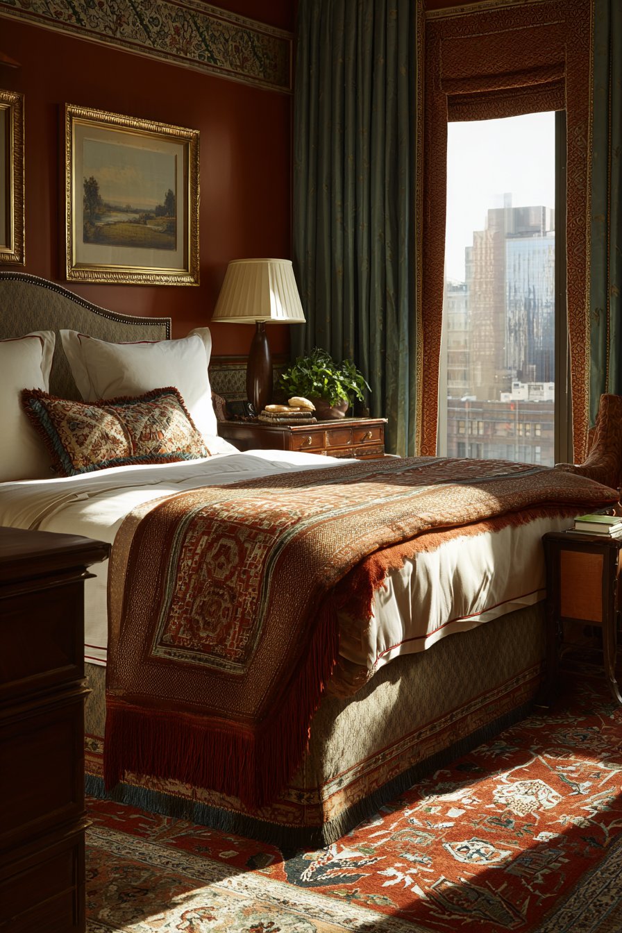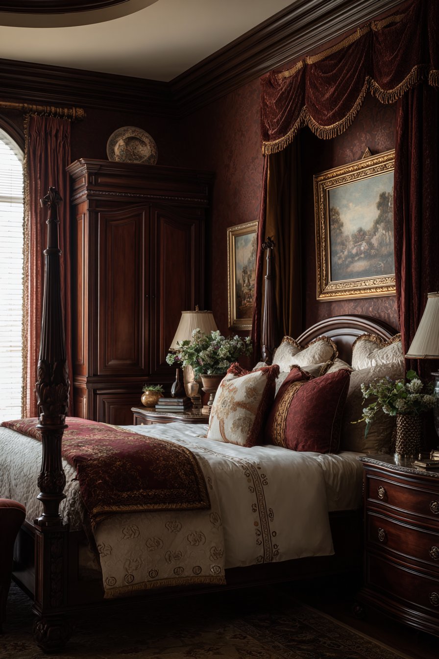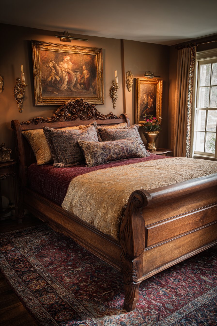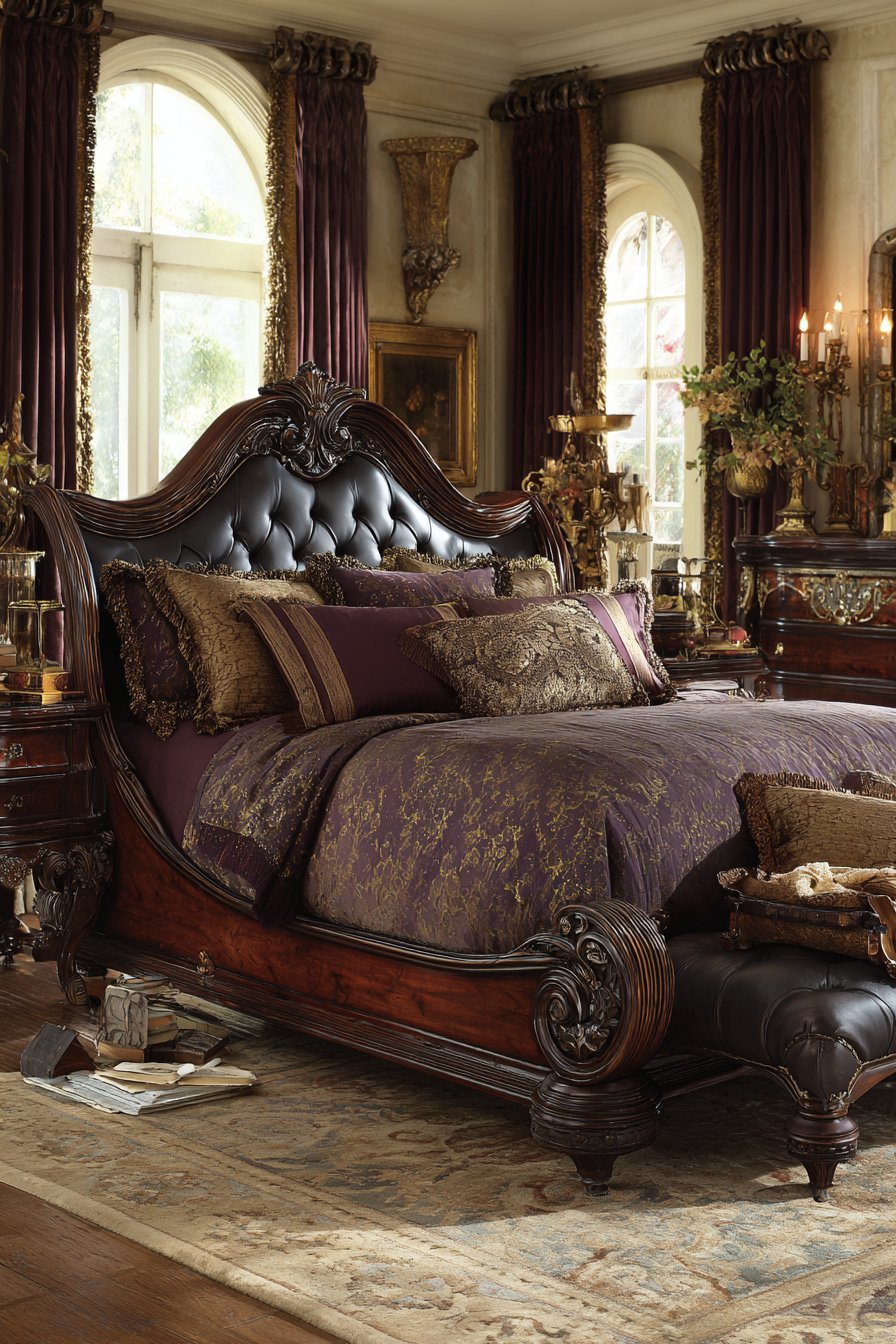 An ornate antique French-style sleigh bed becomes the bedroom’s focal point. Dark cherry wood displays intricate scrollwork across curved headboard and footboard. The craftsmanship represents old-world techniques rarely seen in modern pieces. Silk brocade bedding in deep plum and gold coordinates beautifully with the wood tones. Heavy velvet window treatments feature decorative tasseled tiebacks that add movement.