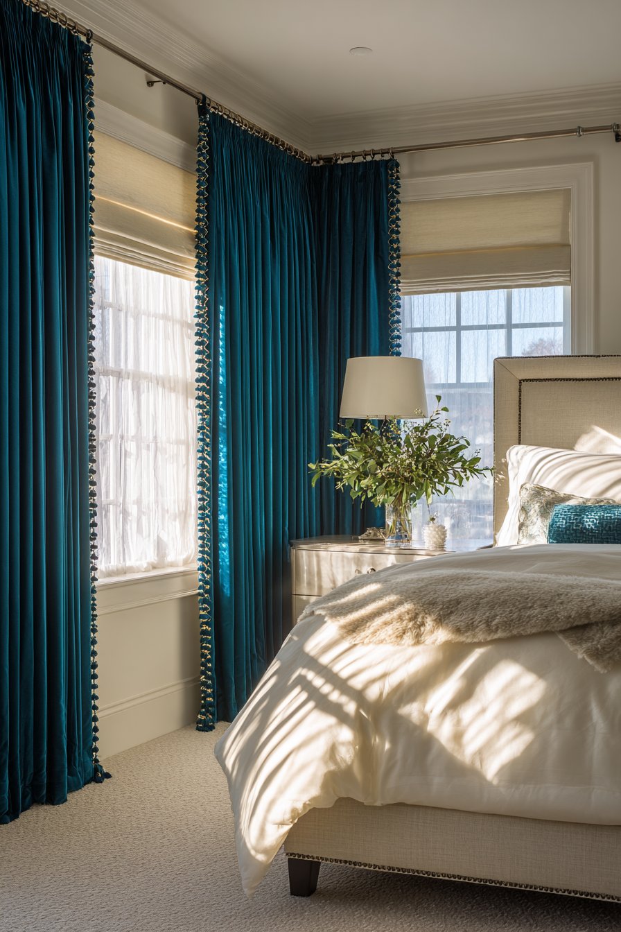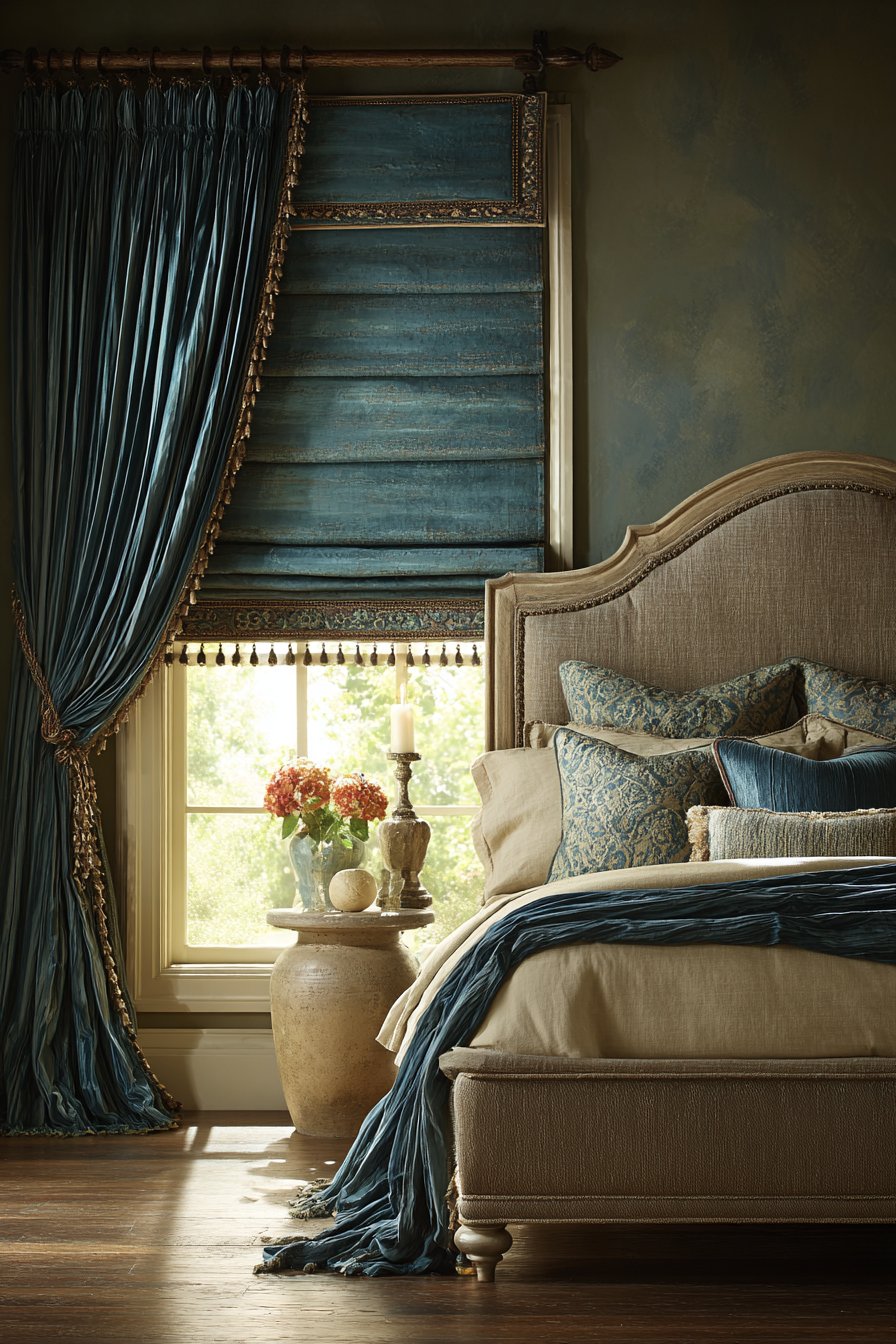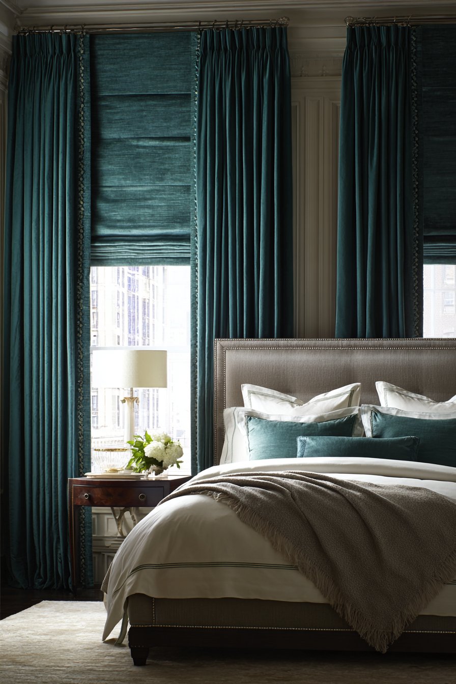 A rich bedroom showcases layered window treatments with exceptional detail. Custom Roman shades in silk dupioni provide the first layer. Heavy interlined velvet drapes in deep teal layer over them. Contrast banding and fringe trim add custom details. The upholstered bed features high headboard in complementary taupe linen. Nailhead detail defines the edges crisply.
