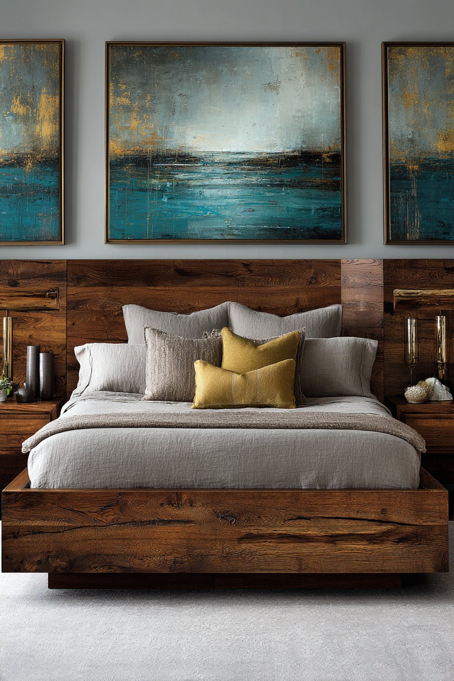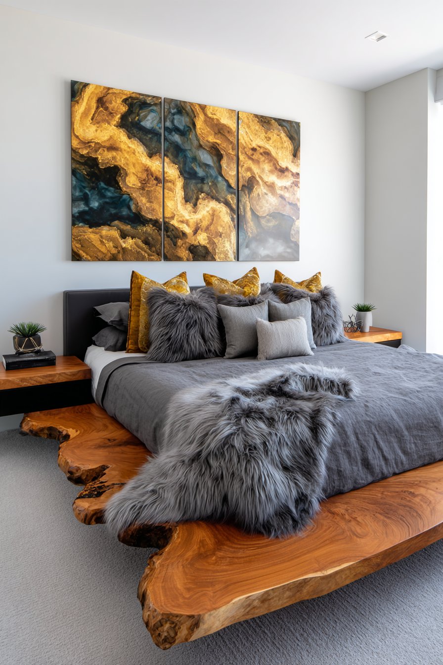 Abstract artwork in gold leaf and deep blues hangs above the bed. The organic shapes complement the live-edge wood. Professional photography shows modern sophistication with balanced natural lighting. The natural wood grain patterns become focal points. Varied textile textures create subtle visual richness throughout.