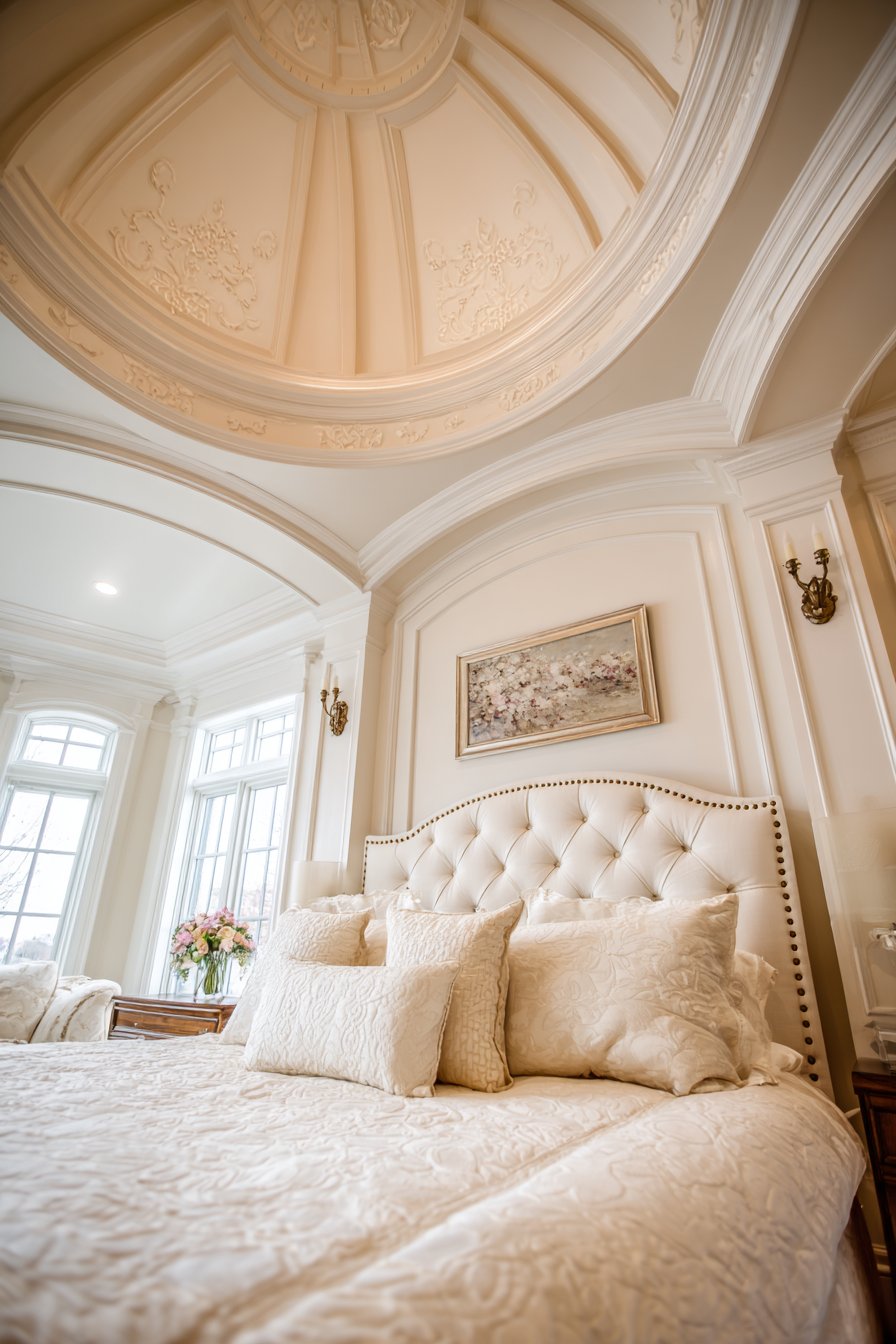 This bedroom demonstrates how architectural elements create luxury. The hand-painted ceiling becomes artwork you experience daily. Concealed lighting eliminates harsh fixtures while providing necessary illumination. The space feels serene and sophisticated simultaneously.