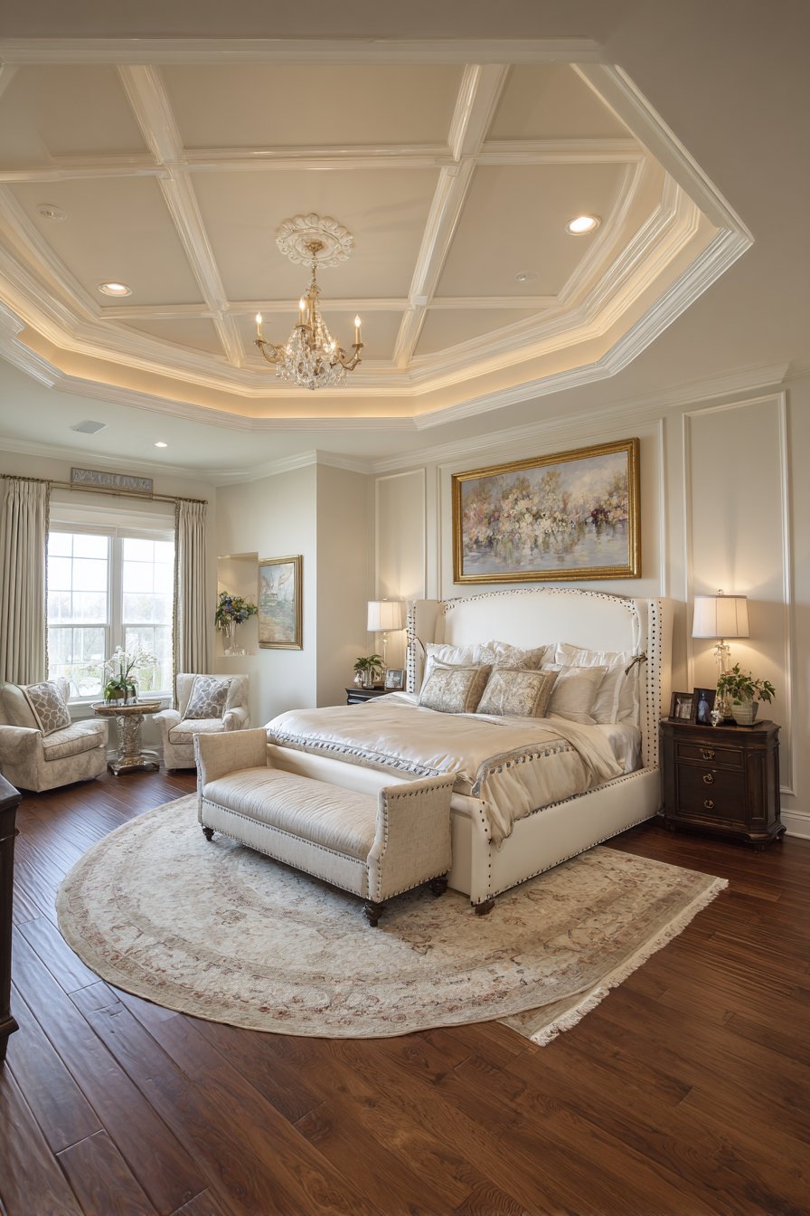 A rich bedroom sanctuary features a statement tray ceiling with hand-painted detail work. Concealed perimeter lighting creates soft ambient glow around the ceiling. The centerpiece bed displays tall wingback headboard upholstered in cream velvet. Antique brass nailheads define the traditional form. Sferra bedding and silk-filled duvet provide ultimate luxury.