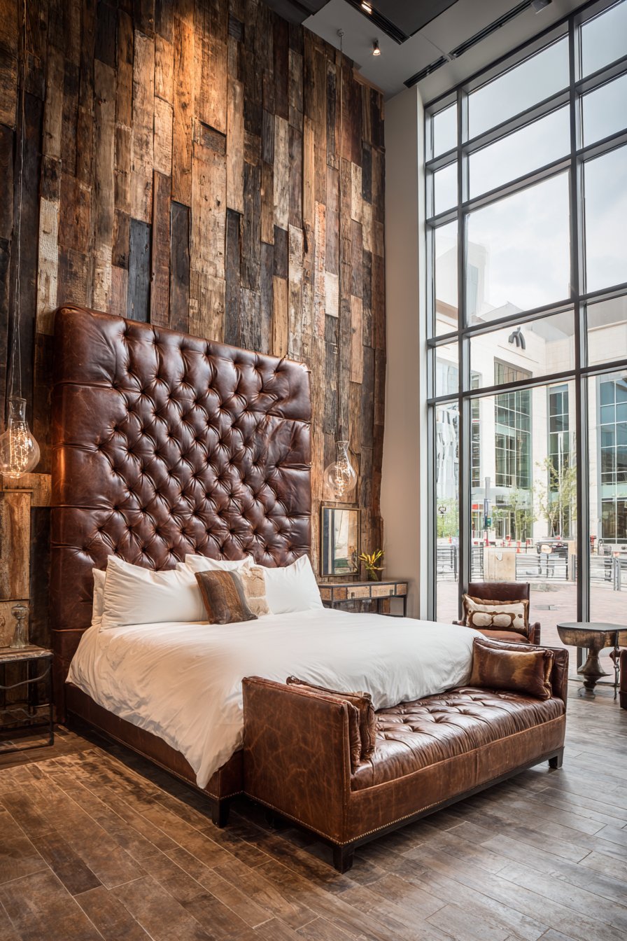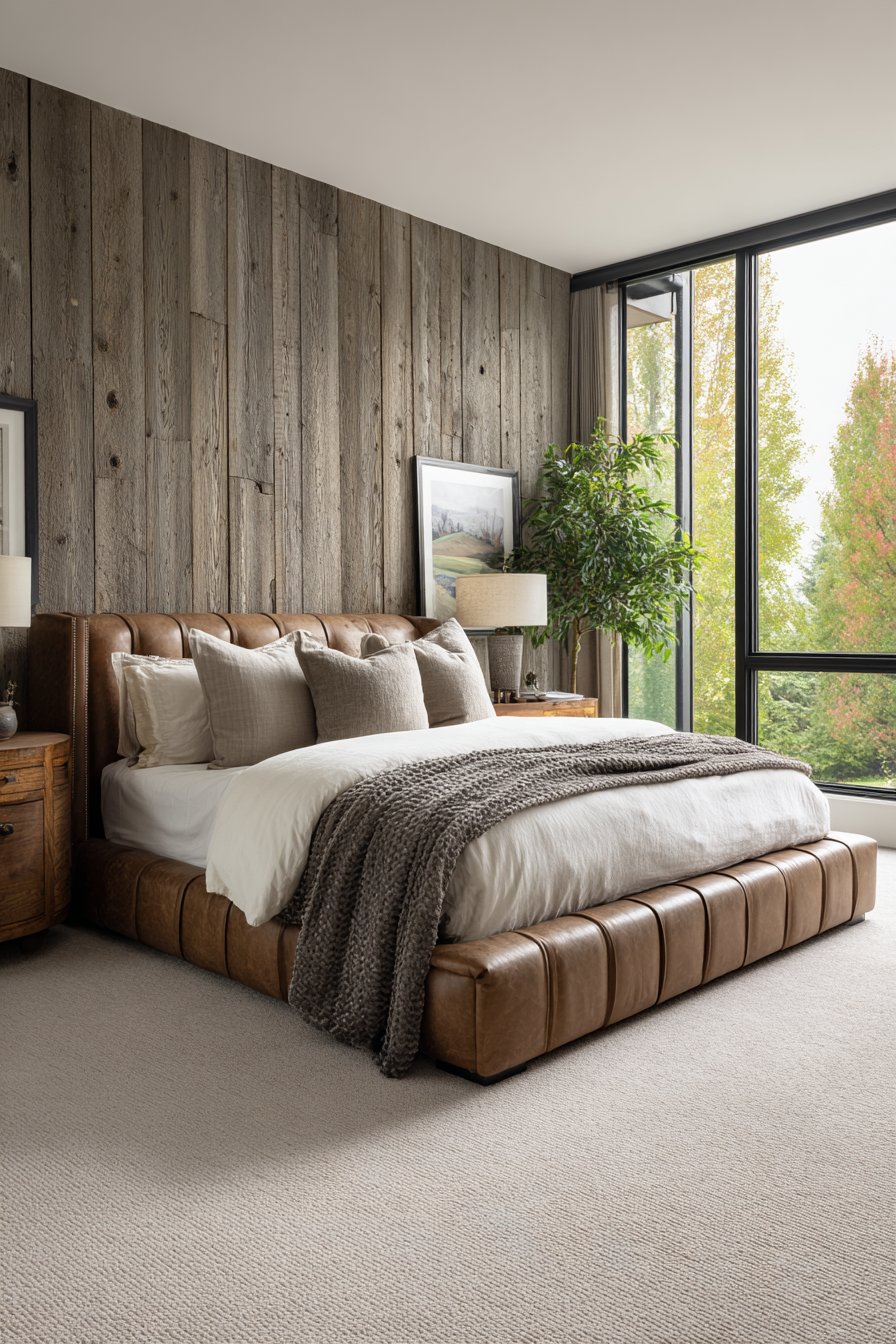 A reclaimed wood accent wall behind the bed adds textural depth. Natural color variations and authentic aging tell stories. Wide-angle photography shows the balanced composition successfully. Natural light from large windows highlights the leather’s rich patina. The wood’s organic character becomes increasingly apparent.