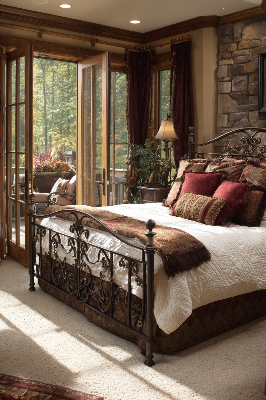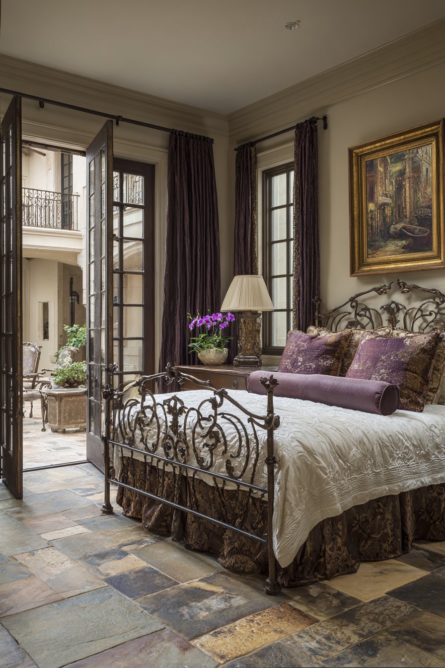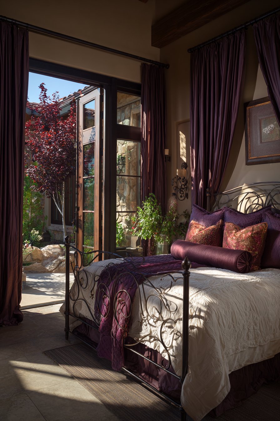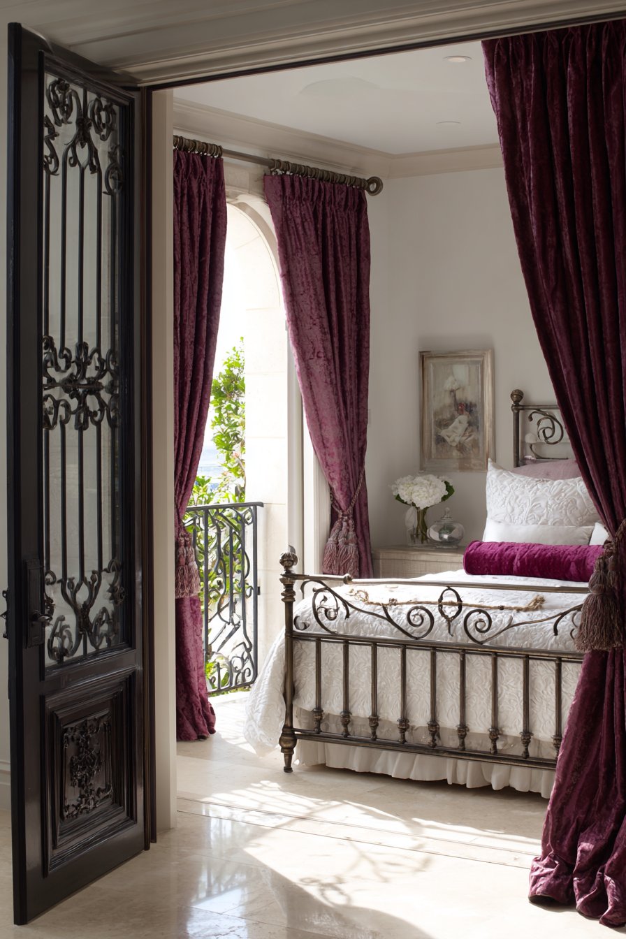 A luxurious rich bedroom features French doors opening to a private balcony. Floor-length silk taffeta curtains in deep garnet frame the opening. Blackout lining ensures darkness when desired. The iron bed frame features ornate scrollwork in oil-rubbed bronze finish. White matelassé coverlet and velvet bolster pillows create classic dressing.