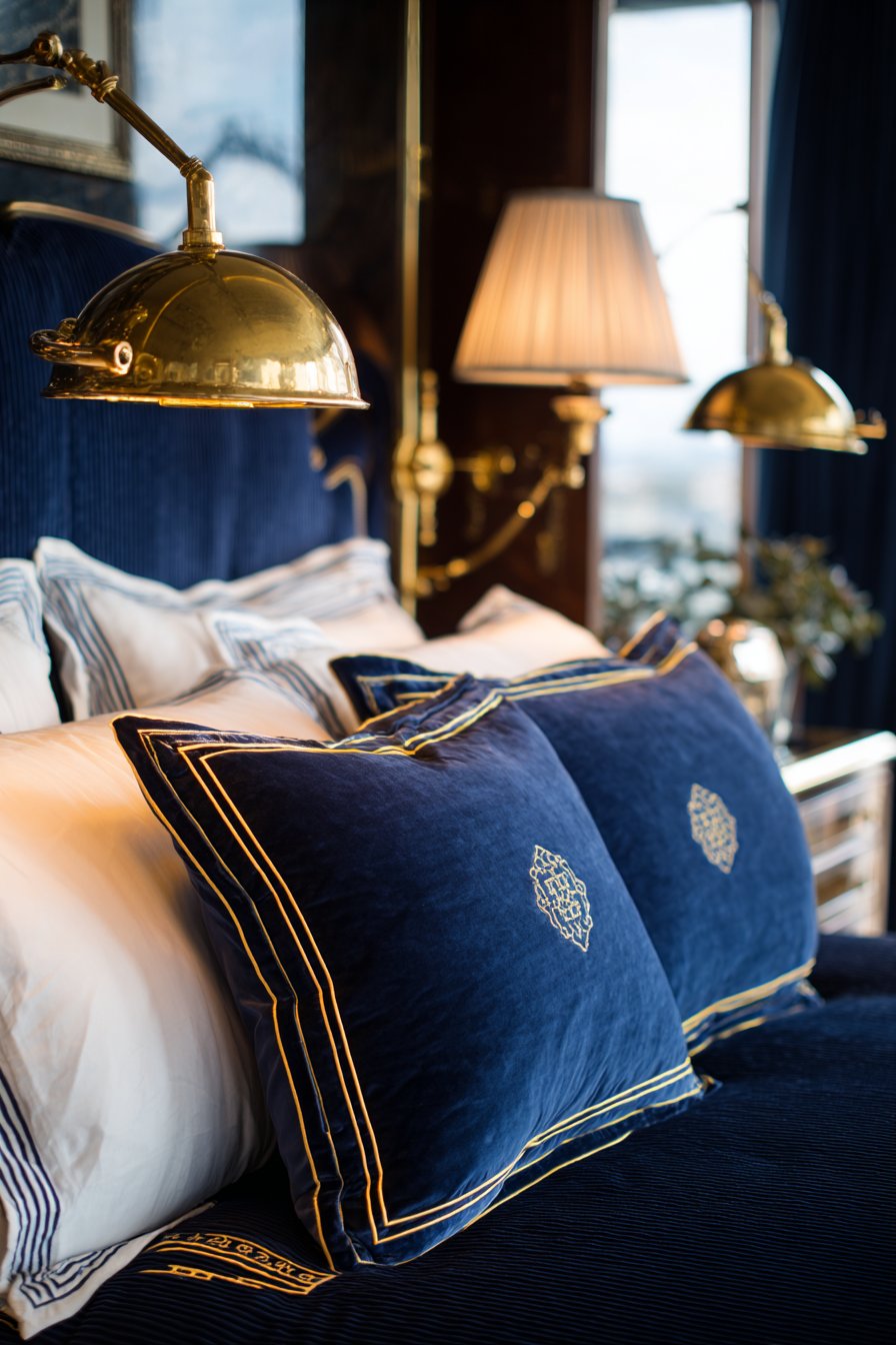 Brass pharmacy lamps with adjustable arms mount to the headboard. They provide reading light without requiring a nightstand space. Interior design photography with warm artificial lighting captures tailored luxury. The precise detailing becomes apparent in close examination. Accurate color representation shows the navy velvet’s true depth.