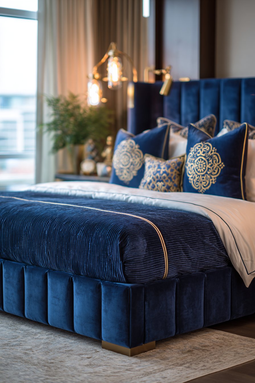 A rich bedroom displays a custom upholstered bed with channel-tufted headboard and footboard. Navy velvet creates depth and richness. Contrasting welt trim in brass-colored piping defines edges precisely. Layered bedding includes silk sheets and down duvet in crisp white. Accent pillows feature embroidered medallion patterns in gold thread.