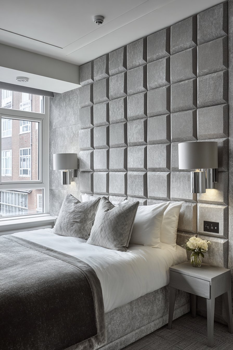 A rich bedroom retreat features walls upholstered in padded linen panels. Subtle texture creates soft cocoon-like environment. The bed displays contemporary upholstered frame in matching linen. Integrated reading lights and USB ports provide modern convenience. Hotel-quality white linens feature precisely mitered corners.