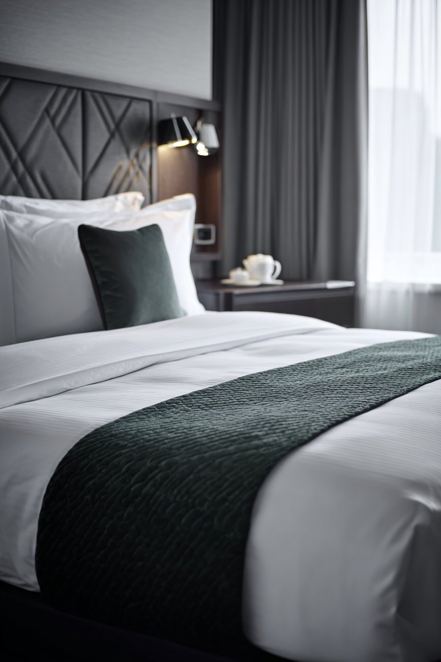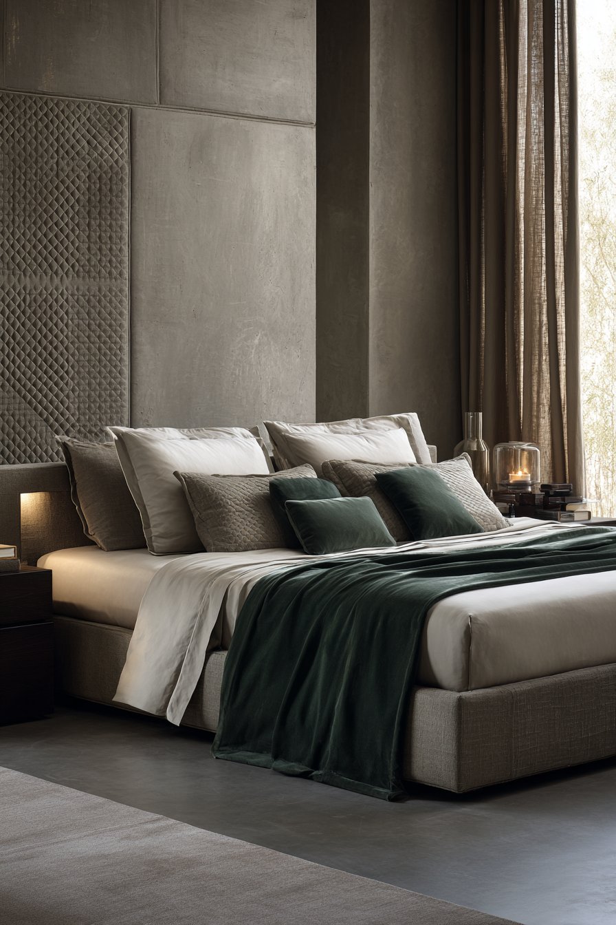 A silk velvet throw in deep forest green adds color accent. The monochromatic palette creates serenity throughout. Architectural photography shows serene sophistication with diffused natural lighting. The subtle tonal variations in the monochrome become apparent. The quilted wall treatment’s dimensional quality adds depth.
