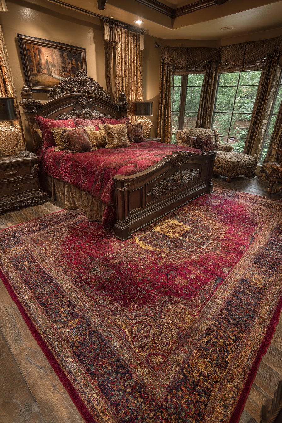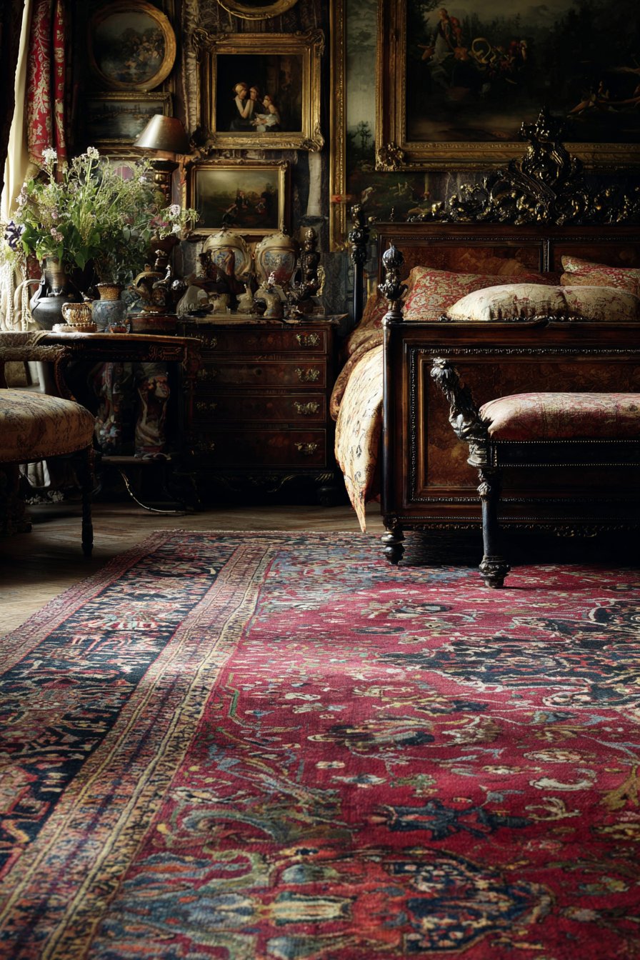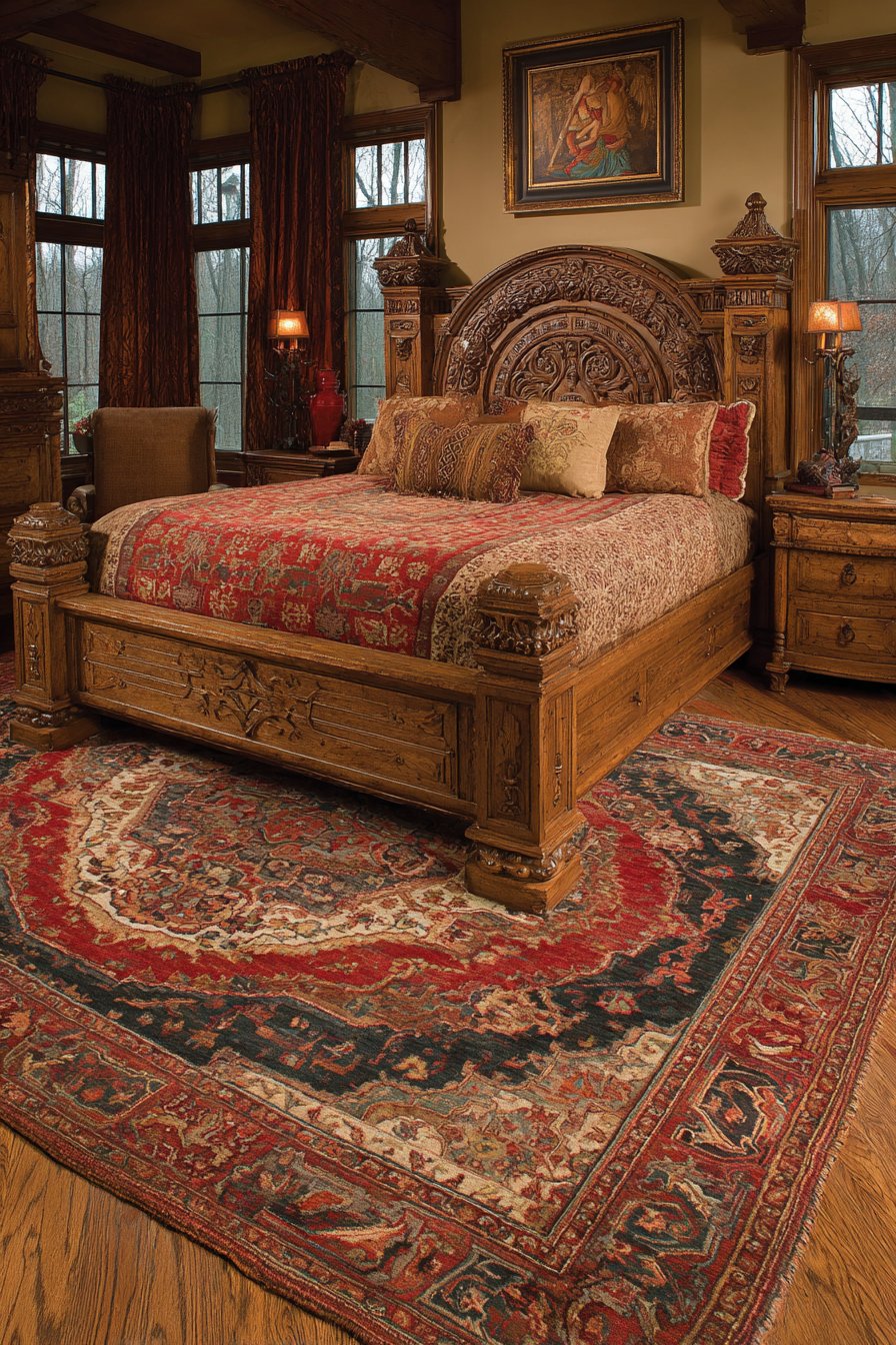 A rich bedroom features a restored antique Persian rug as a foundation. Traditional medallion pattern displays deep reds, navy, and gold. A carved walnut bed frame with an elaborate headboard sits upon it. Cherubs and acanthus leaf motifs demonstrate fine craftsmanship. Silk damask bedding coordinates with the rug palette beautifully.