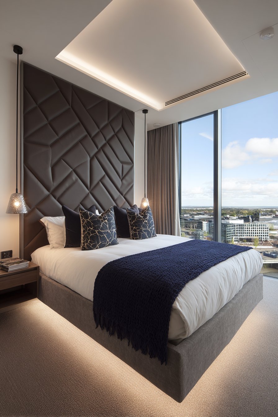 - Choose oversized leather headboards for dramatic architectural presence