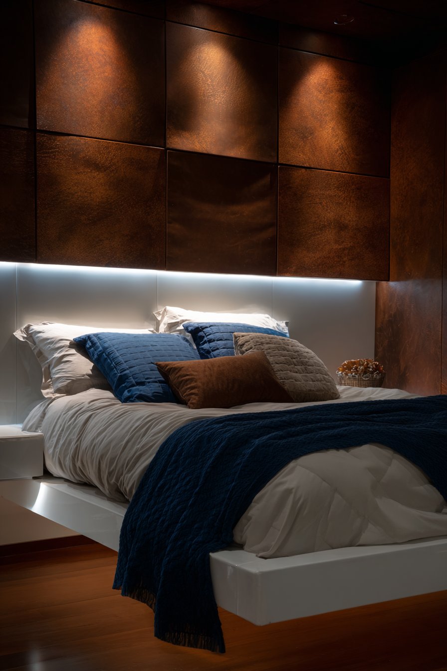 A modern rich bedroom features a suspended bed design with concealed LED lighting beneath. The floating effect creates contemporary drama. Grey suede upholstery provides clean geometric lines and tactile luxury. Floor-to-ceiling leather wall panels in chocolate brown create rich backdrop. White Italian linen bedding contrasts with navy cashmere throw.