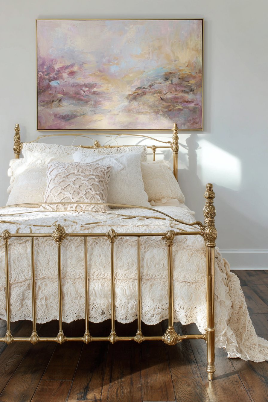 - Select iron bed frames with ornate details for romantic aesthetics